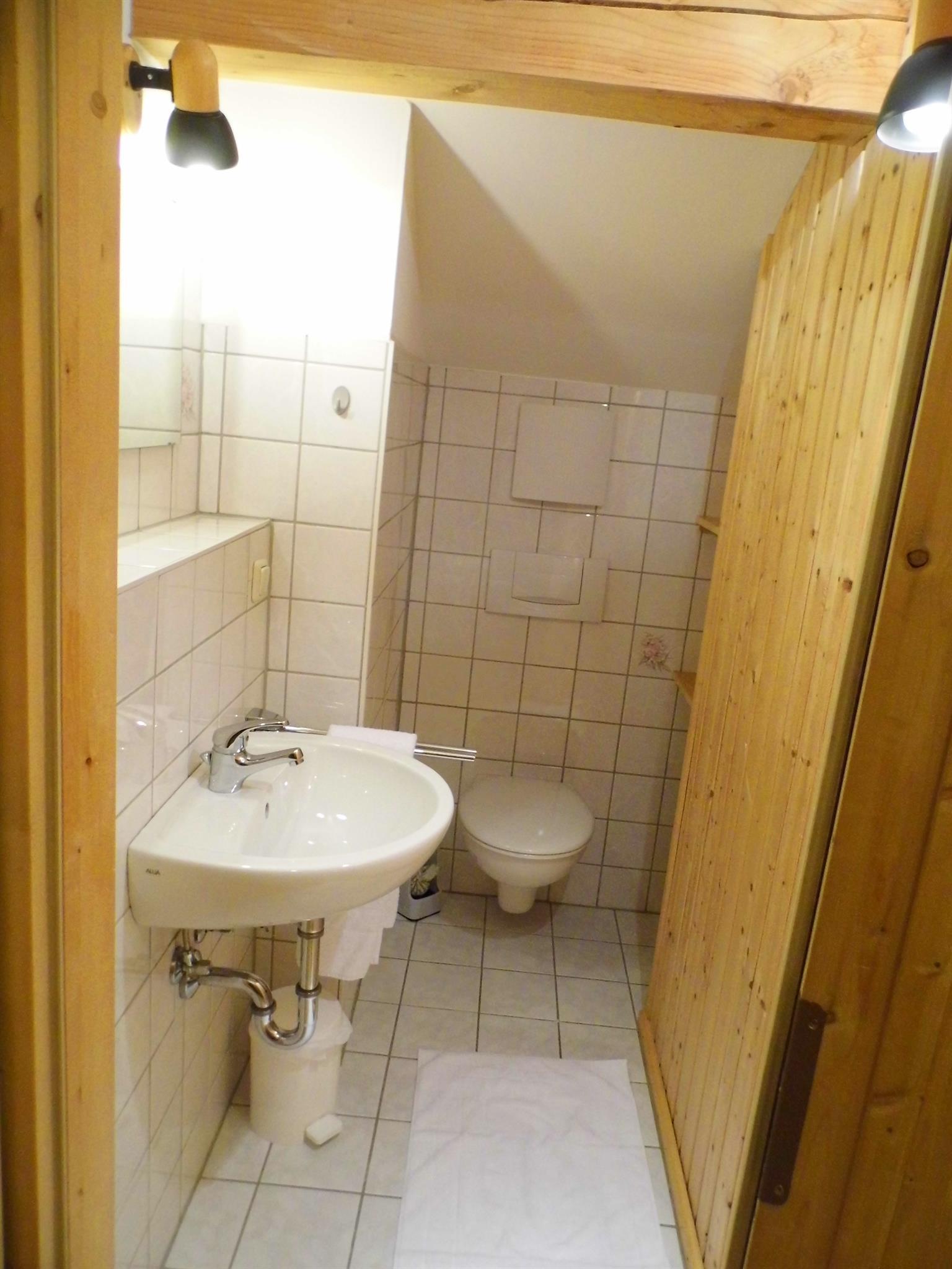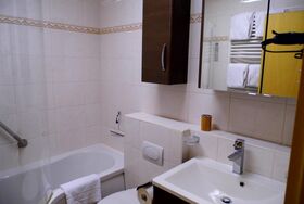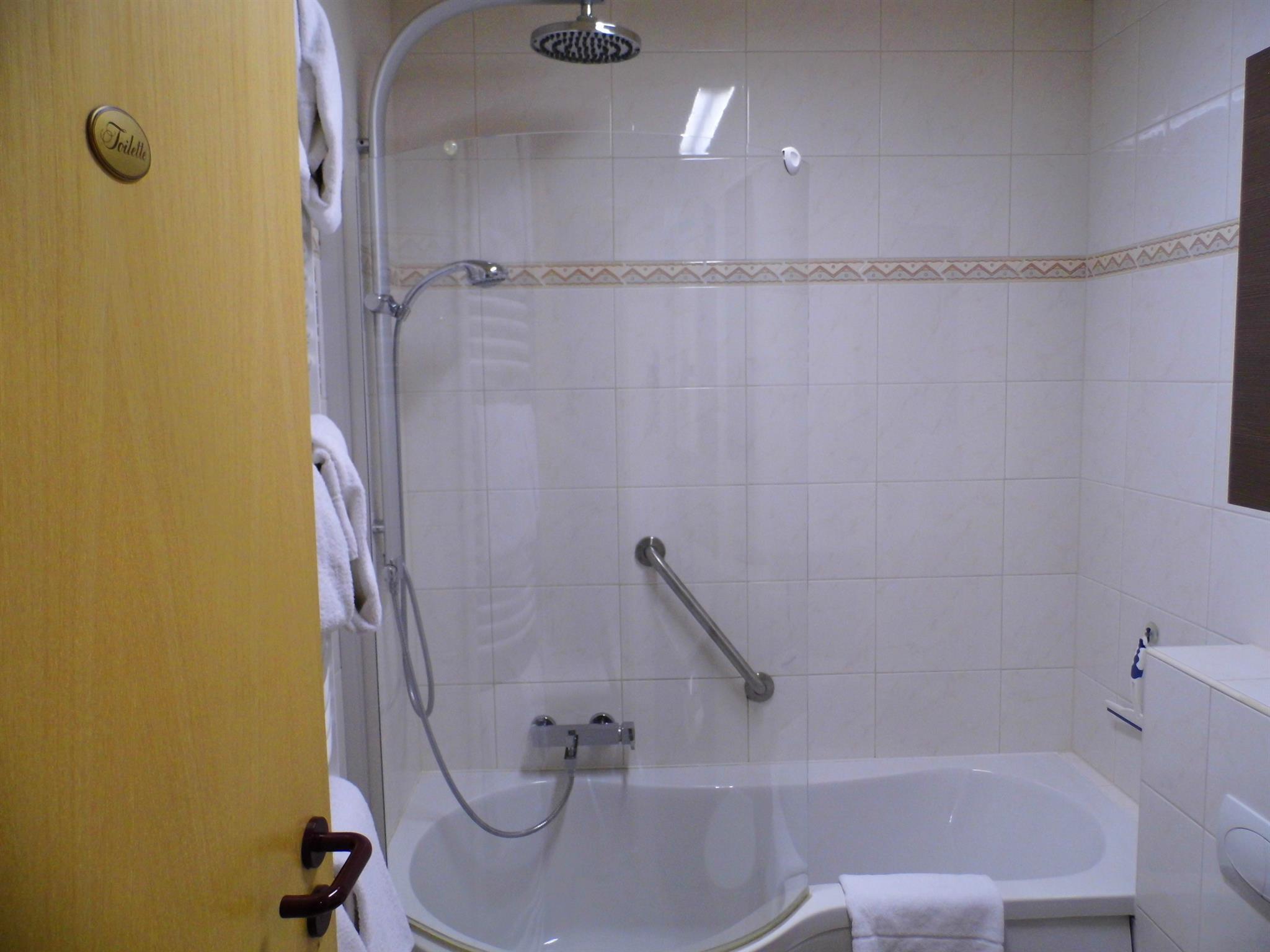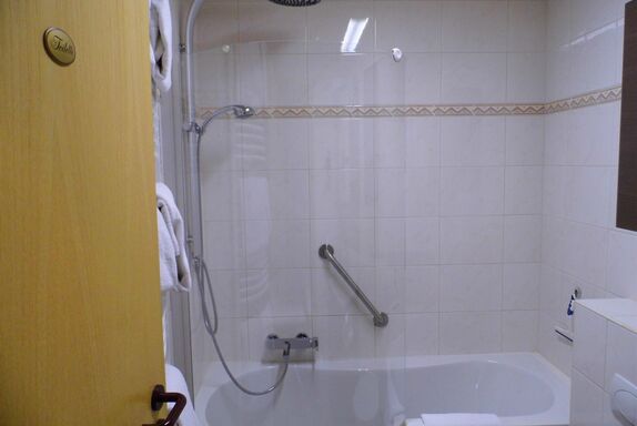Badezimmer mit WC: Badewannen-Duschkombination, Handtuchheizkörper, Fön.