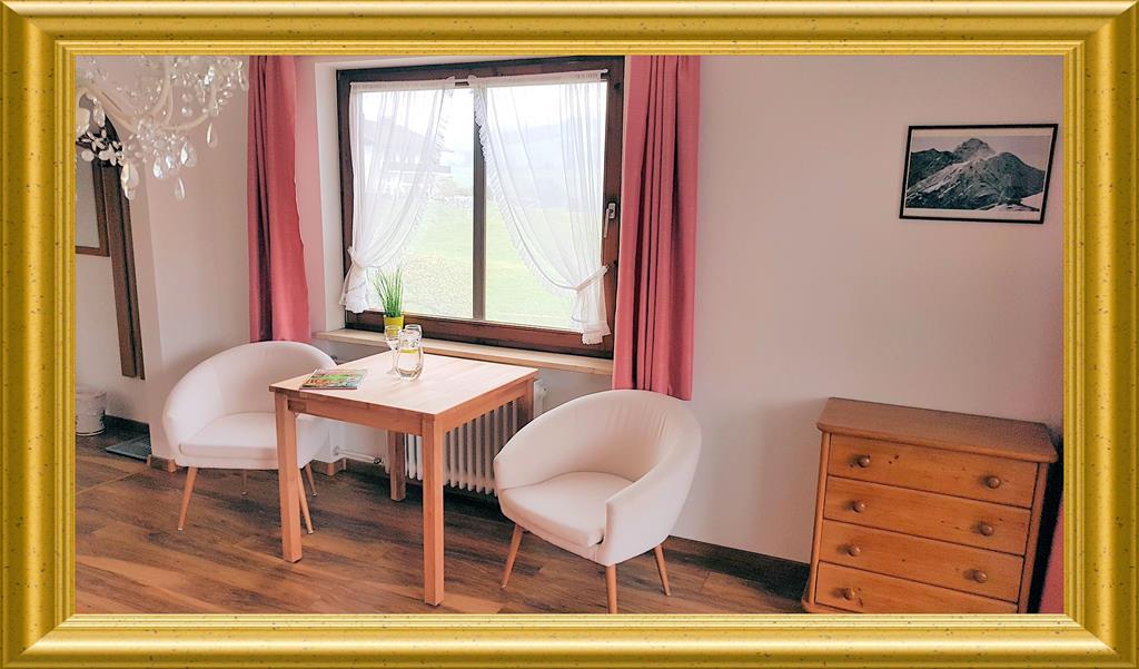 Helle stilvolle Zimmer mit Balkon und einmaligen Blick auf die Oberstdorfer Skischanzen. Alle Zimmer sind mit Dusche, WC, Sat-TV, Sitzgruppe und WLan ausgestattet. Es steht Ihnen eine Teeküche mit Wasserkocher, Microwell, Geschirr und Kühlschrank zur Verfügung. Morgens erfreuen Sie sich im gemütlichen Frühstücksraum an unserem leckeren Frühstück mit freundlichen Service.