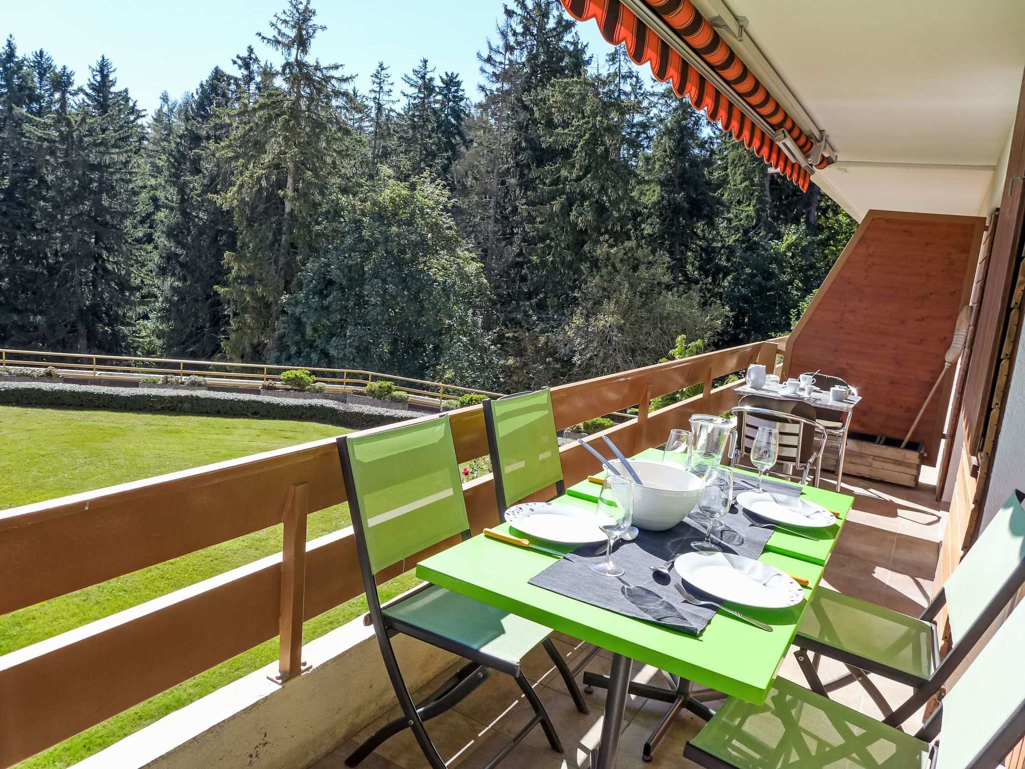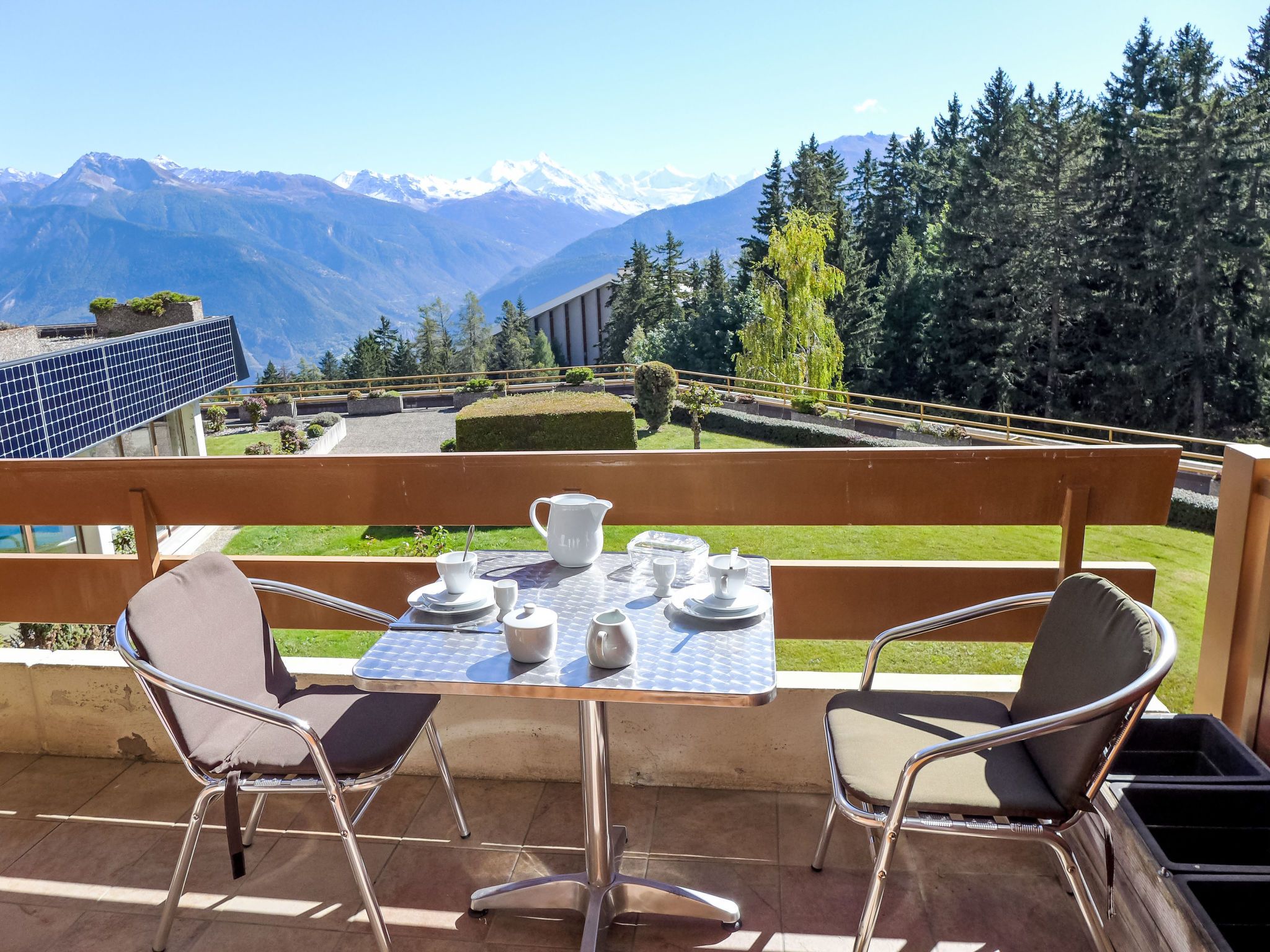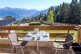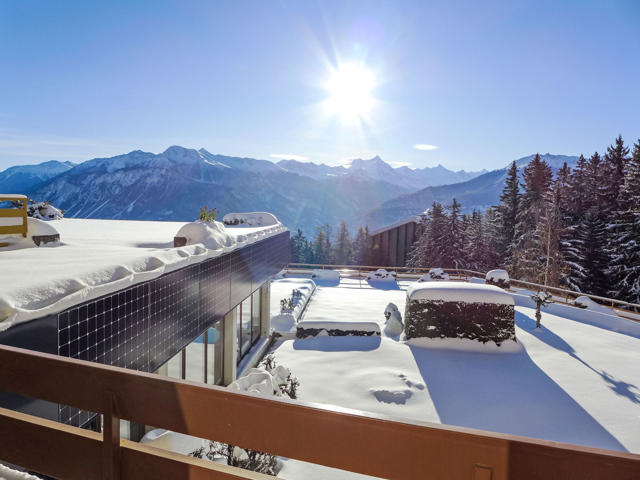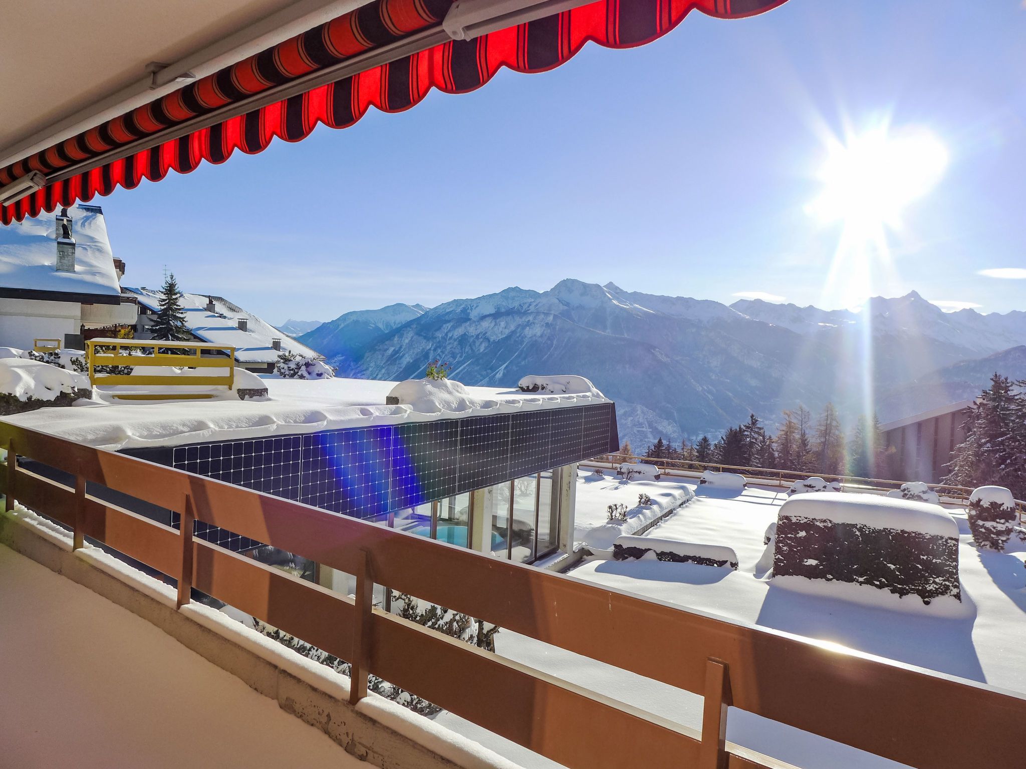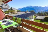 Schwimmbad (ca. 26°) und Sprudelbad (ab 16 Jahre alt) im November geschlossen. Das Gebäude wurde auf einem geneigten Grundstück erbaut. Die Stockwerke werden als Ebenen betrachtet, die ab Residenzboden nummeriert sind. Bei starkem Schneefall, ist es gemäss den Anweisungen des Administrators untersagt, die Terrassen vom Schnee zu räumen. Terrassenhaus Terrasse des Alpes. Im Ortsteil Marigny, 400 m vom Zentrum von Montana, sonnige Lage, 1.5 km vom See, 1.5 km vom Skigebiet, Richtung Südwesten. Zur Mitbenutzung: Hallenbad beheizt (12 x 5 m, saisonale Verfügbarkeit: 01.Jan. - 31.Okt. und z. - z. Öffnungszeiten Schwimmbad: 08:00-20:00). Sprudelbad, Terrasse. Im Hause: Aufenthaltsraum, Fahrstuhl, Skiraum, Zentralheizung, Waschmaschine, Wäschetrockner (zur Mitbenutzung, extra). Einkaufsgeschäft, Supermarkt, Restaurant, Bar, Café 400 m, Zentrum zu Fuss in 5 Minuten erreichbar, Bushaltestelle Montana Poste 300 m, Bahnstation Funiculaire Montana Gare 450 m, Badesee Moubra 1.5 km. Golfplatz (18 Loch) 3.8 km, Skisportanlagen 1.5 km. Bitte beachten: Gratis Skibus.