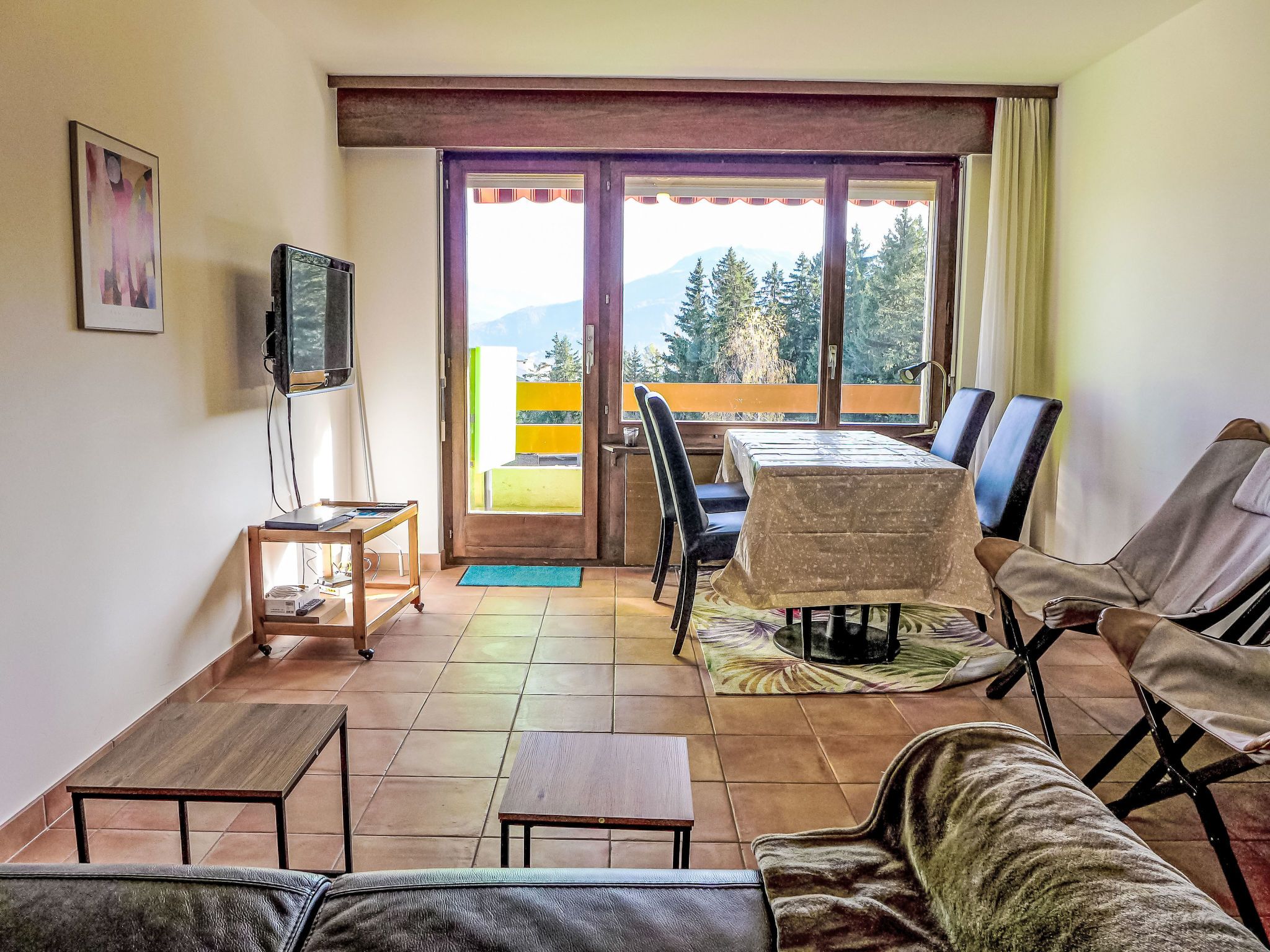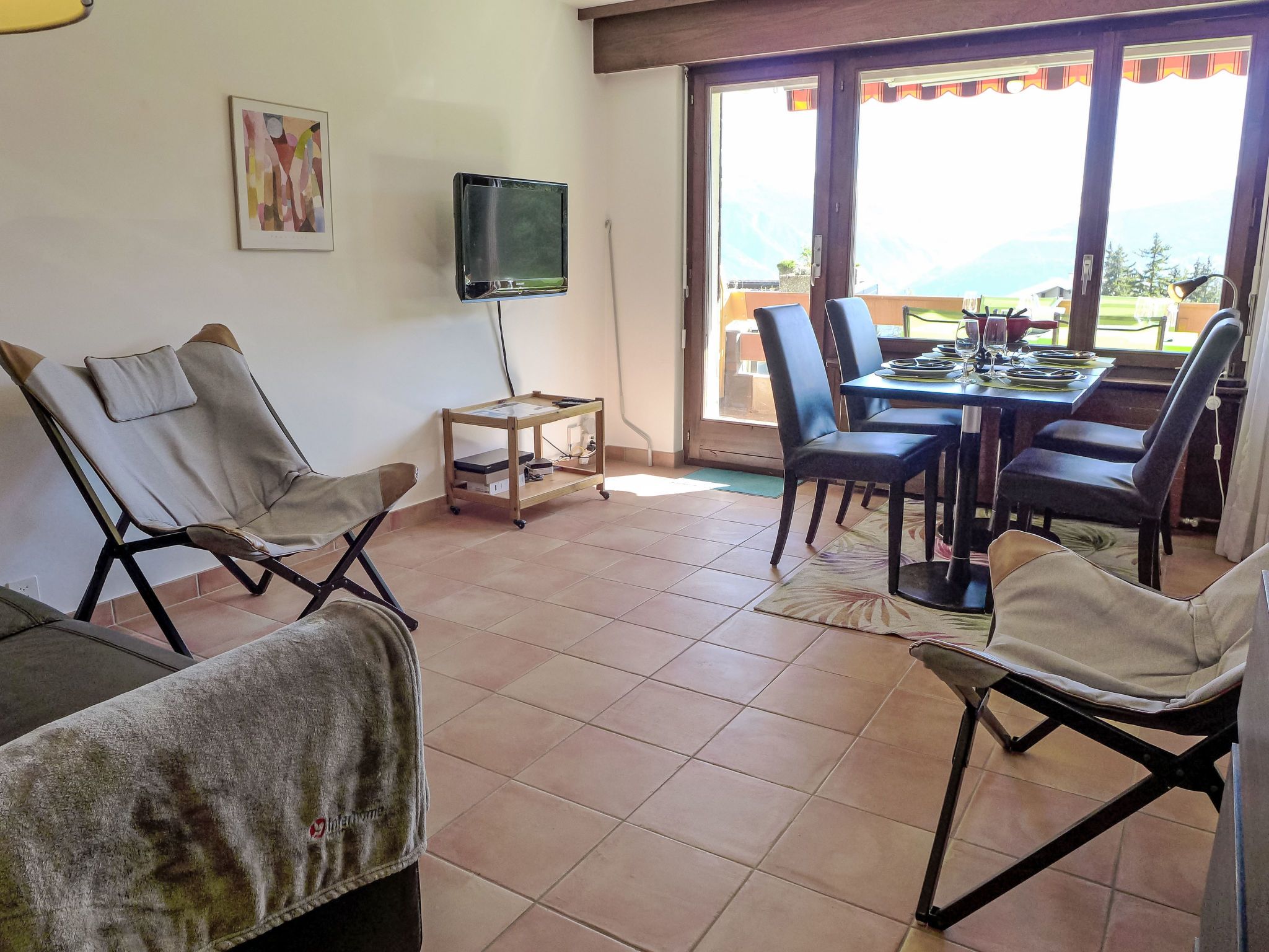 Terrasse des Alpes 2006, 2-Zimmer-Wohnung 49 m2 im 7. Stock. Teilweise renoviert im Jahre 2020, komfortabel und schön eingerichtet: Wohn-/Esszimmer mit 1 Diwanbett (140 cm, Länge 190 cm), Kabel-TV, Radio und DVD. Ausgang zum Balkon. 1 Zimmer mit 1 franz. Bett (180 cm, Länge 200 cm). Ausgang zum Balkon. Offene Küche (4 Kochplatten, Backofen, Geschirrspüler, Toaster, Wasserkocher, Mikrowelle, elektrische Kaffeemaschine, Kapseln für die Kaffeemaschine (Nespresso) extra, Racletteofen, Fondue Set (Chinoise, Käse)). Dusche/WC. Balkon 10 m2, Südlage. Balkonmöbel. Schöne Sicht auf die Berge. Zur Verfügung: Haartrockner. Internet (WLAN, gratis). Garage Nr. 73, Höhe 200 cm, Breite 230 cm. Bitte beachten: Nichtraucher-Unterkunft. Maximal 1 Haustier/Hund erlaubt.