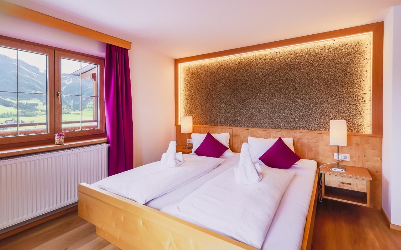 In unseren modern gemütlichen Zimmern aus hellem Massivholz genießt ihr viel Platz, warme Farben und eine wunderbar frische, komfortable Einrichtung mit Dusche/WC, Flat-TV, Wlan, Föhn, Handtuchtrockner und Balkon Richtung Tal und Bergseite. In unseren Familienzimmern mit 2 seperaten Schlafraümen bieten noch Platz für bis zu 2 Kindern.
