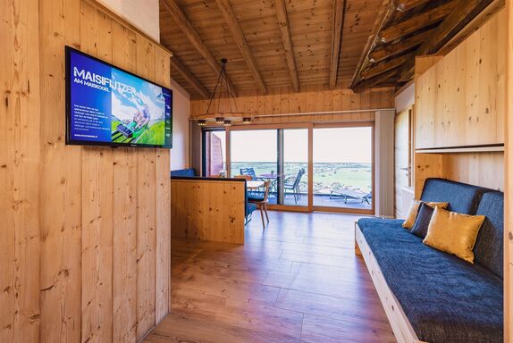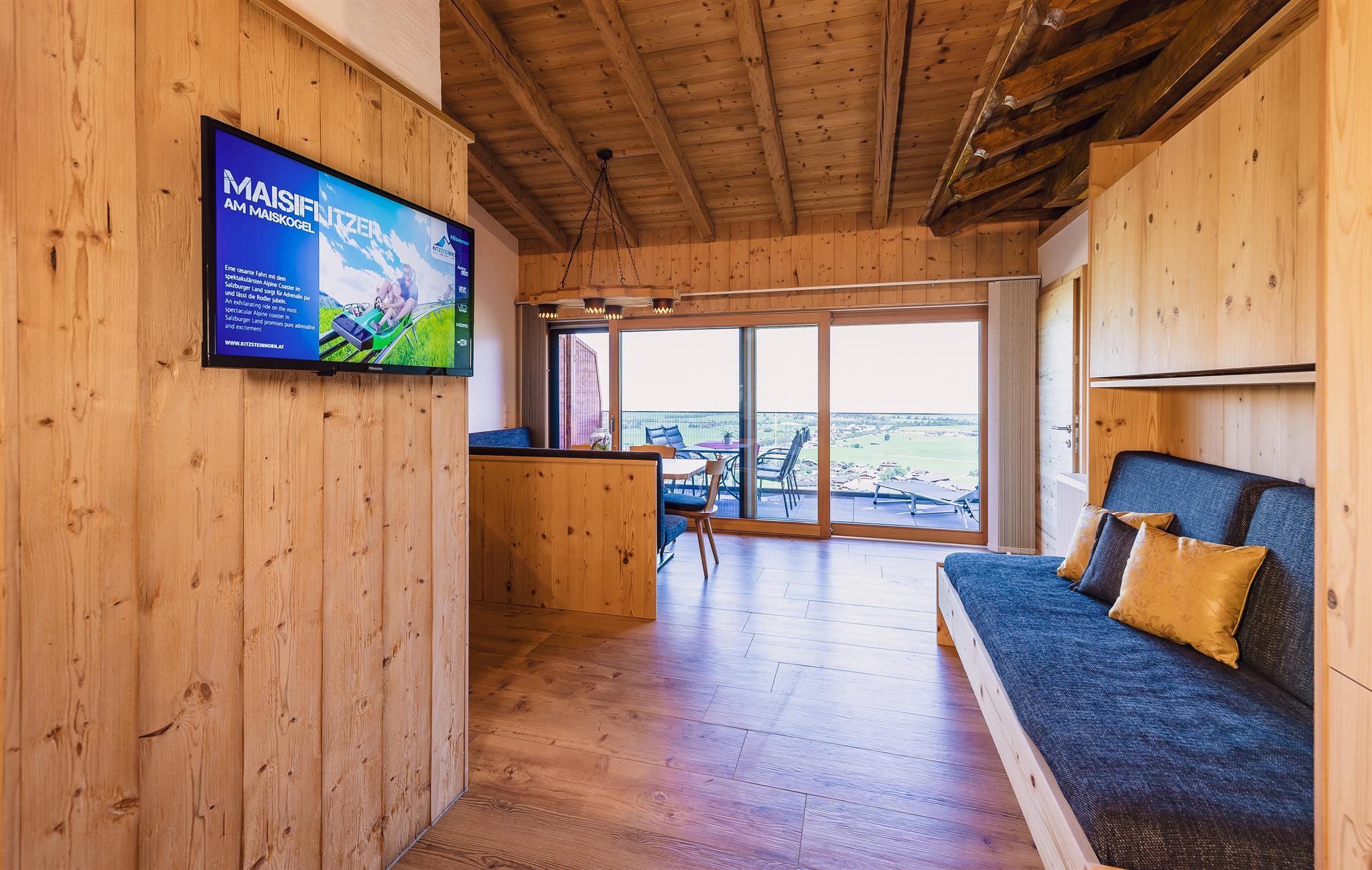Das lichtdurchflutete Appartement bietet ein ganz neues Wohngefühl mit natürlichen Materialien, wie eine Heu-Tapete aus reinen, natürlichen Stoffen aus dem Pinzgau.