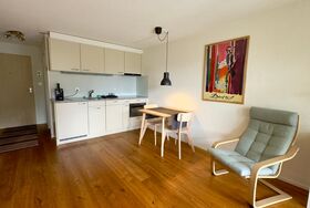 Wohn-, Schlafraum mit Polstersessel, Essecke, 2 Klappbetten (90x200), W-LAN, TV.
