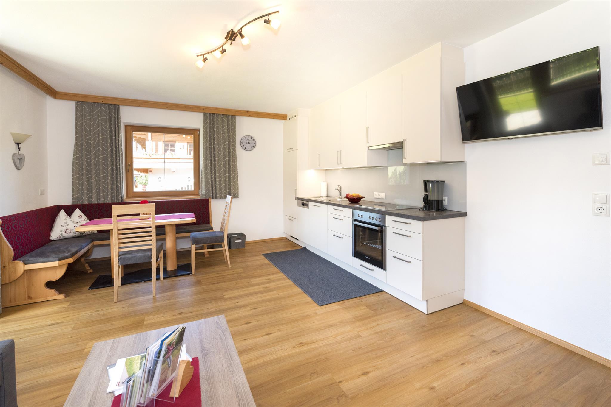 Wir bieten Ihnen eine neu errichtete Ferienwohnung 70m², zwei getrennte Schlafzimmer mit Doppelbetten, Bad und WC getrennt, Küche/Wohnraum mit Esstisch und gemütlichen Sofa, Geschirrspüler, Kühlschrank, TV, kostenloses Wlan, familienfreundlich, große Terrasse und Grünfläche mit Sitzgelegenheit, Parkplatz vor dem Haus, Skischuhtrockner