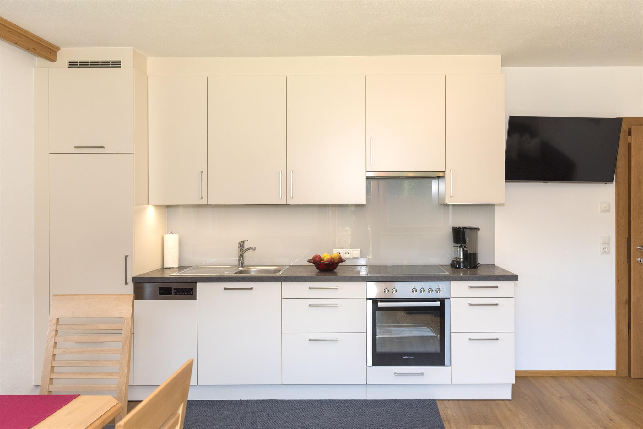 Die Küche ist ausgestattet mit Elektroherd und Backrohr, Kühlschrank, Geschirrspülmaschine, Wasserkocher, Frühstückstoaster, Kaffeemaschine, Kochtöpfe & Pfanne, Geschirr, Gläser & Besteck.