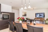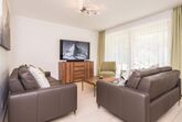 Diese sehr geräumige 4 1/2 - Ferienwohnung (120m²) verfügt über 3 Doppelzimmer und ein Wohnzimmer mit Sitzgruppe, Kabel - TV, Radio, Wi-Fi und DVD. Die Küche ist modern eingerichtet mit einem Esstisch, einem Backofen und einem Geschirrspüler.