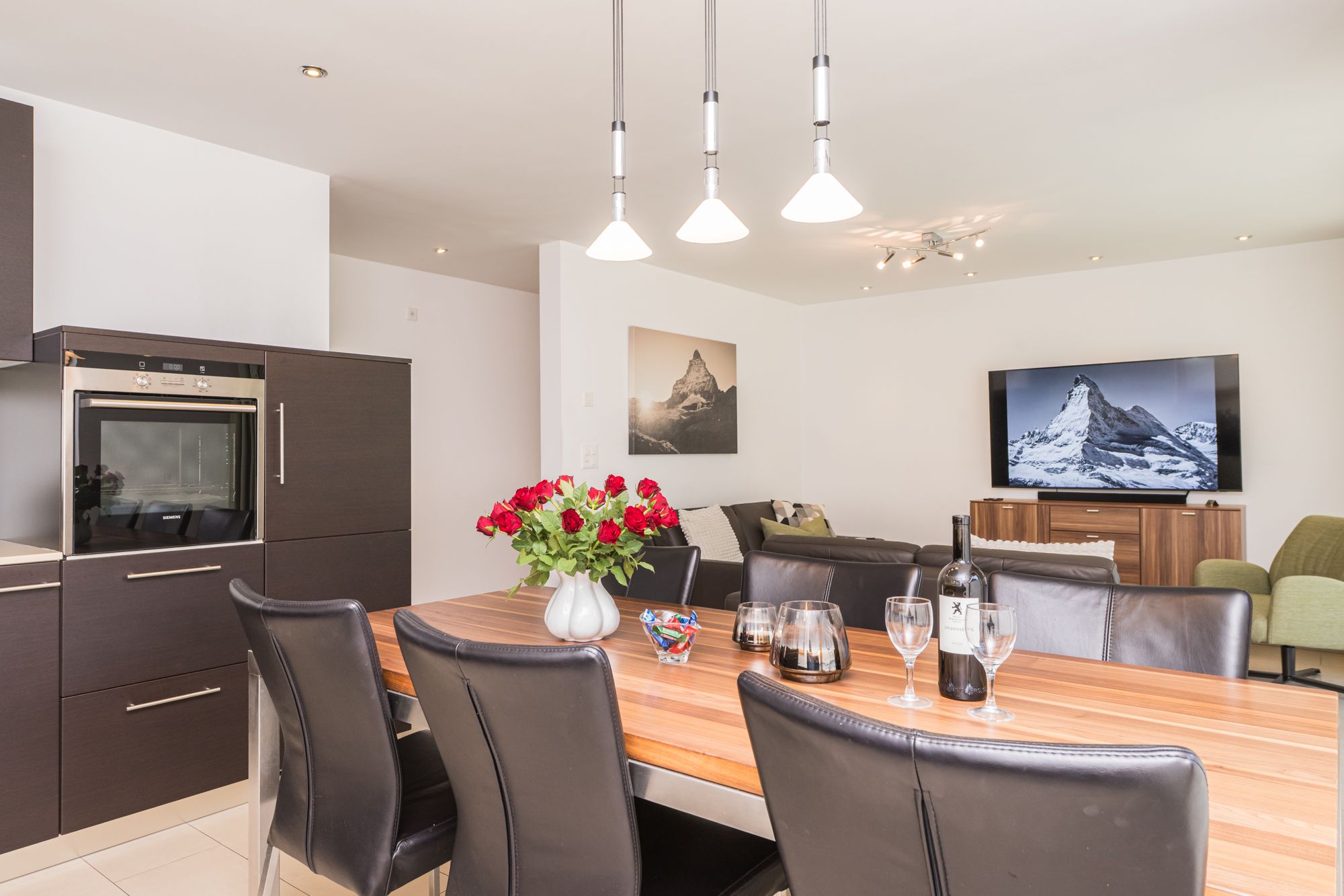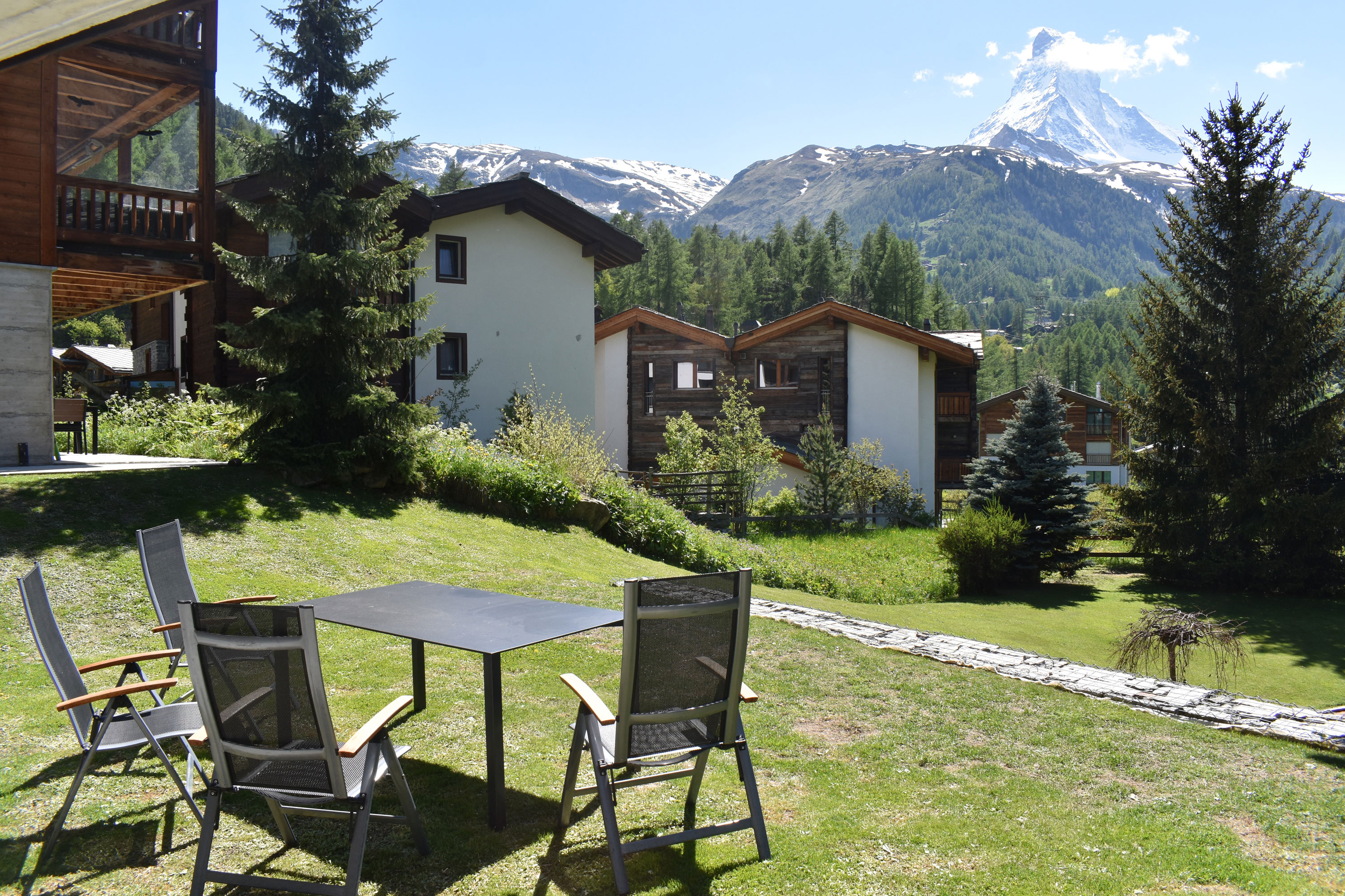 Die grosse, sonnige Terrasse mit freier Sicht aufs Matterhorn rundet das Angebot ab und macht diese Ferienwohnung zur idealen Mietwohnung in Zermatt.