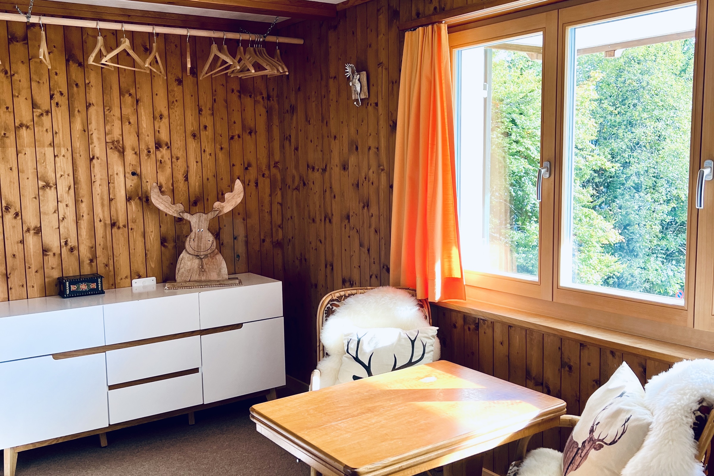 Die 4.5 Zimmer Maisonette-Wohnung (ganzes Chalet) verfügt über zwei Schlafzimmer mit Doppelbett und Kajütenbett, im EG ein zusätzliches Schlafzimmer mit 2 Betten ab 5 Personen ein Badezimmer mit Dusche/WC, im EG ein zusätzliches Badezimmer mit Sauna ab 5 Personen ein offenes Wohnzimmer mit zwei Sofas, Lesesessel sowie Essbereich mit Esstisch, Eckbank und Stühlen eine moderne Küche mit Kochherd, Backofen, Kühlschrank, Geschirrspüler, Kaffee-/Wasserkocher, Toaster