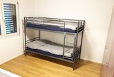 1 Schlafzimmer mit einem Kajütenbett und einem vollwärtig ausziehbaren Doppelbett. Badezimmer