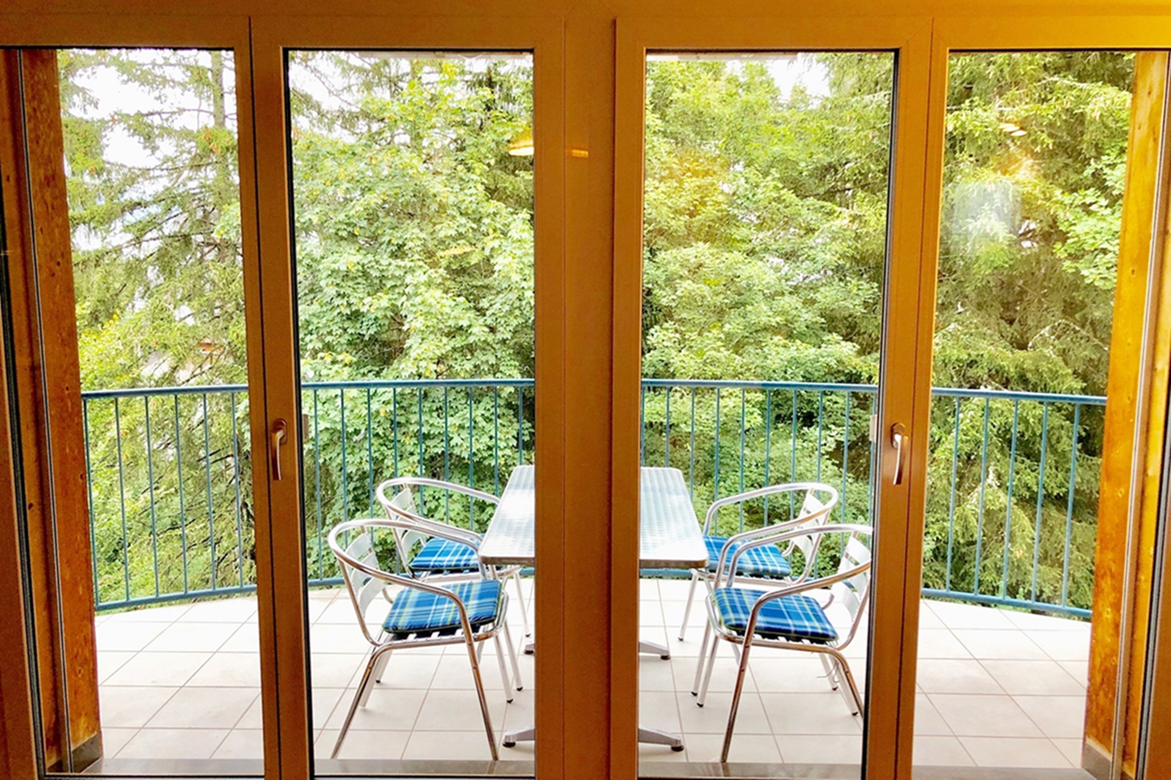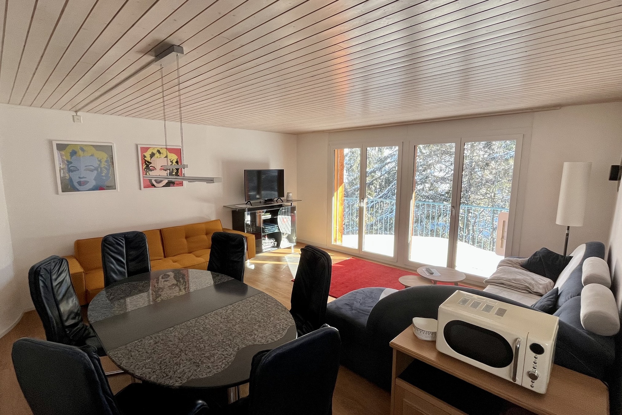 Im offenen Wohnzimmer gibt es zusätzlich noch ein bequemes Bettsofa. TV vorhanden. Zugang zum Balkon welcher 8m2 gross ist. Küche