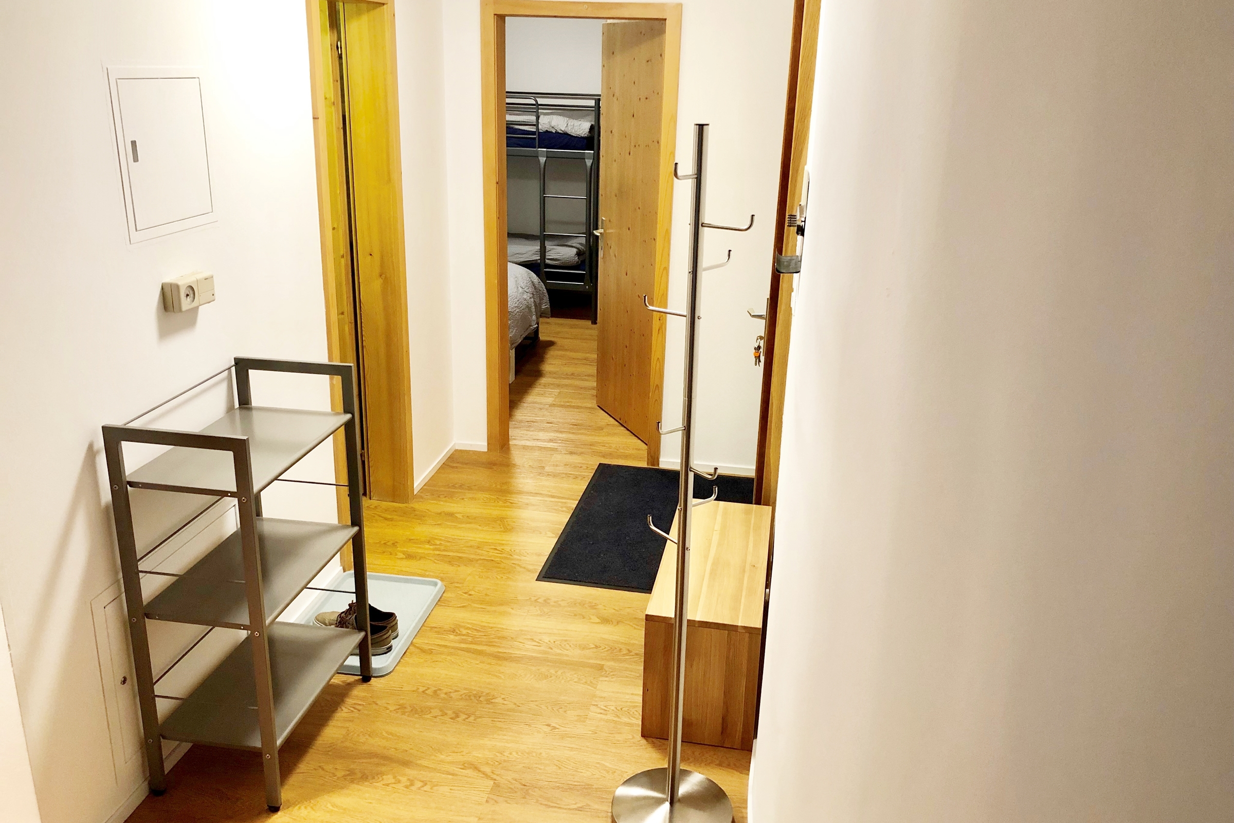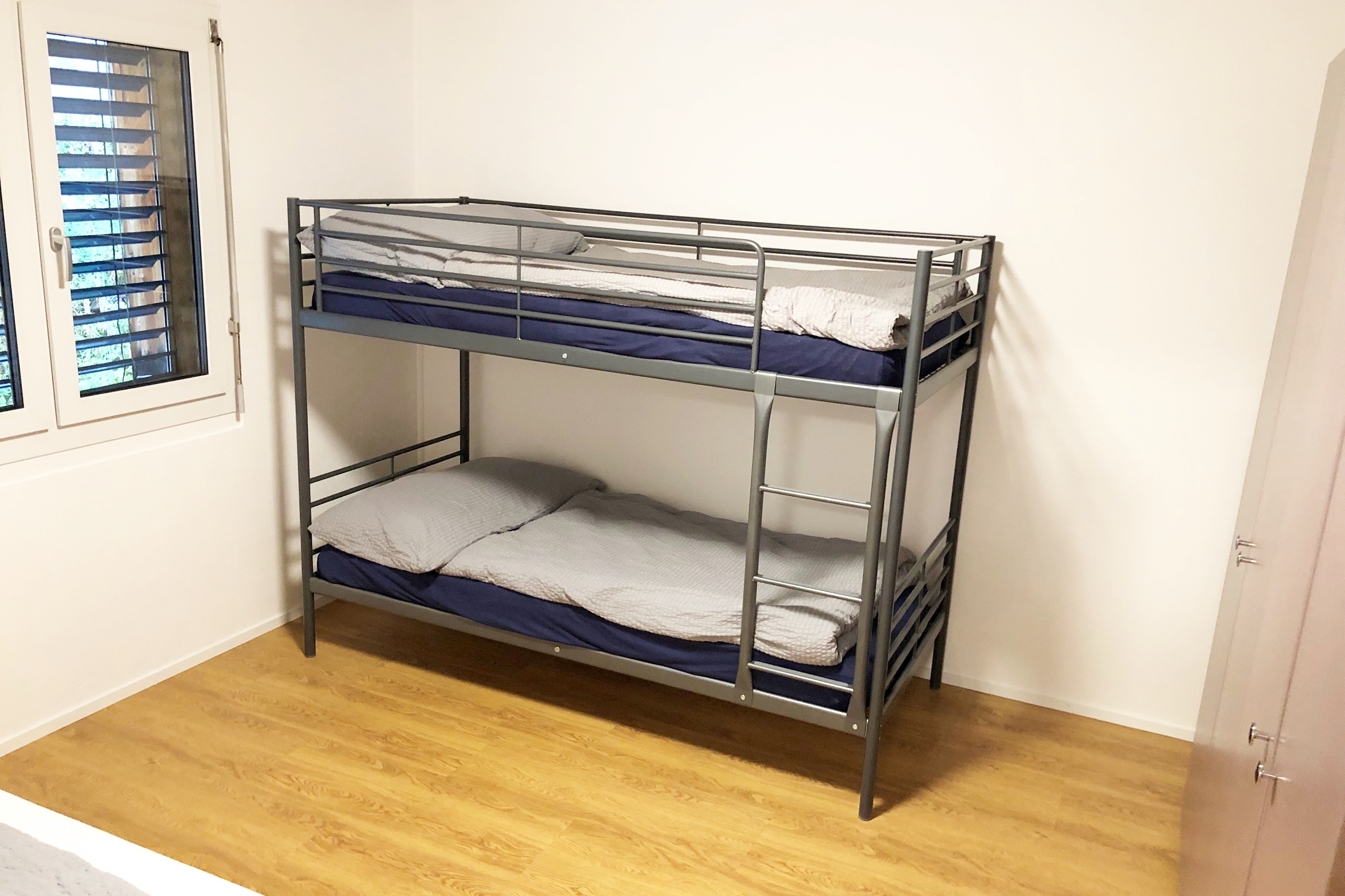 Die Ferienwohnung verfügt über ein Schlafzimmer mit Kajüttenbett und ein vollwärtiges ausziehbares Doppelbett ein Badezimmer mit Dusche, WC und Lavabo