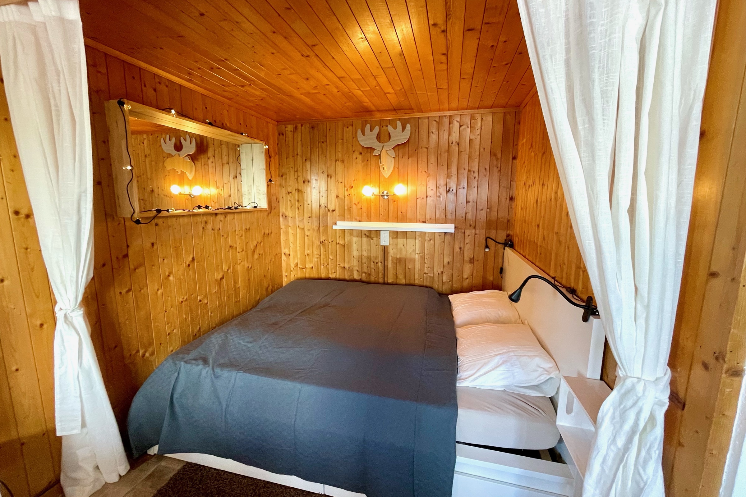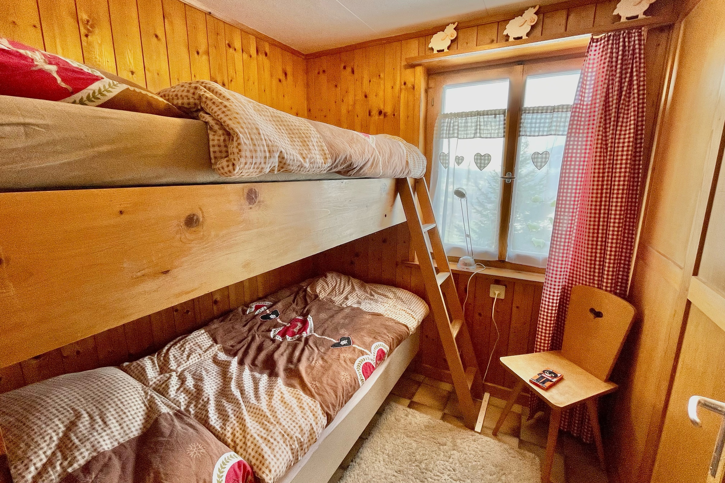 Die Ferienwohnung verfügt über ein Schlafzimmer mit Doppelbett (160x200cm) und ein Kinderschlafzimmer mit Etagenbett, ist mit einem Vorhang räumlich getrennt.ein Badezimmer mit Dusche, Lavabo und WCein offenes Wohn-/Esszimmer mit einem kleinen Schlafsofa (90x180cm)eine voll ausgestattete KücheInneneinrichtung & Technik