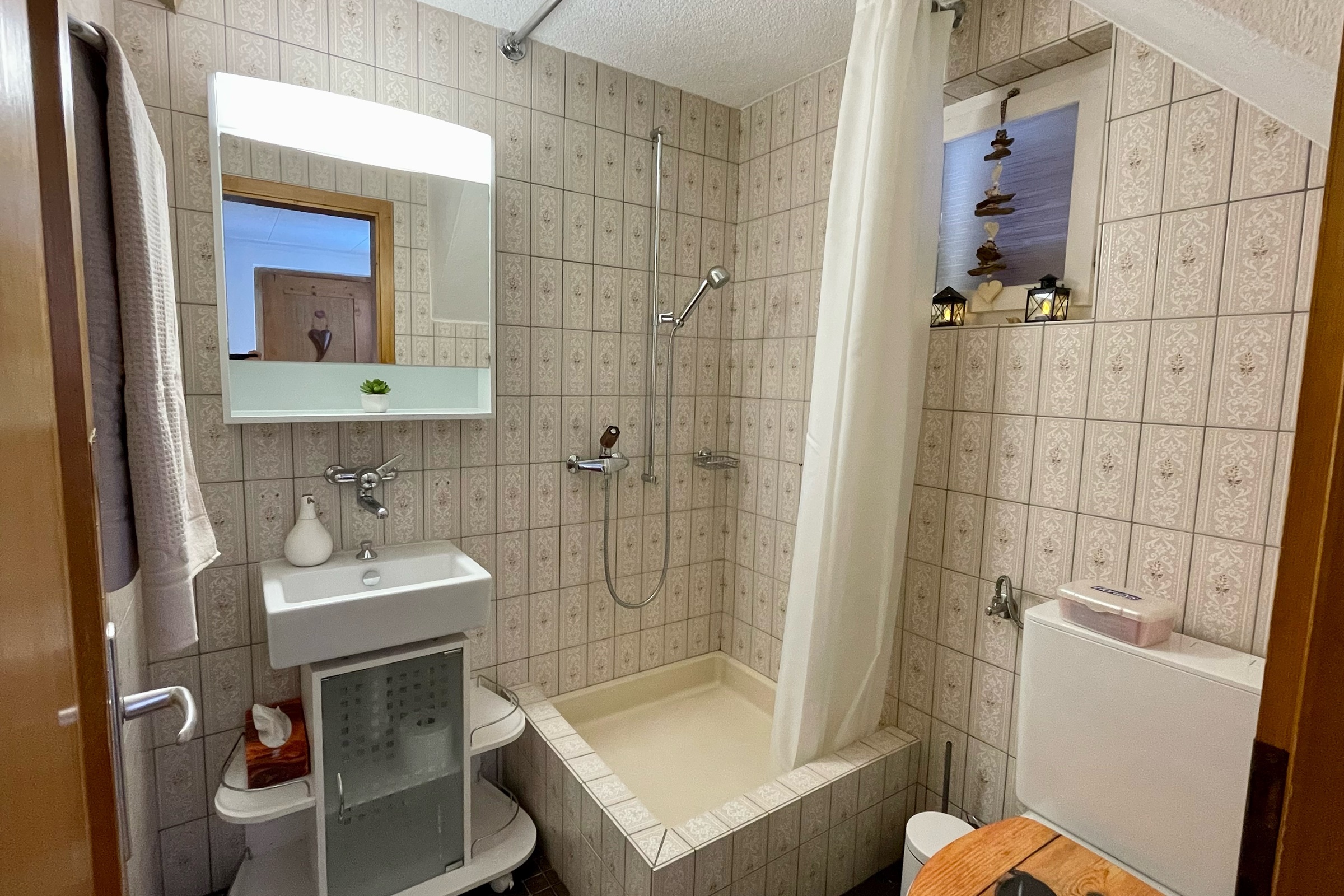 Die Wohnung verfügt über ein Schlafzimmer mit einem Doppelbett (160x200cm) und ein Kinderzimmer mit Etagenbett. Das Doppelzimmer ist ohne Türe und wird lediglich mit einem Vorhang räumlich abgetrennt.Badezimmer