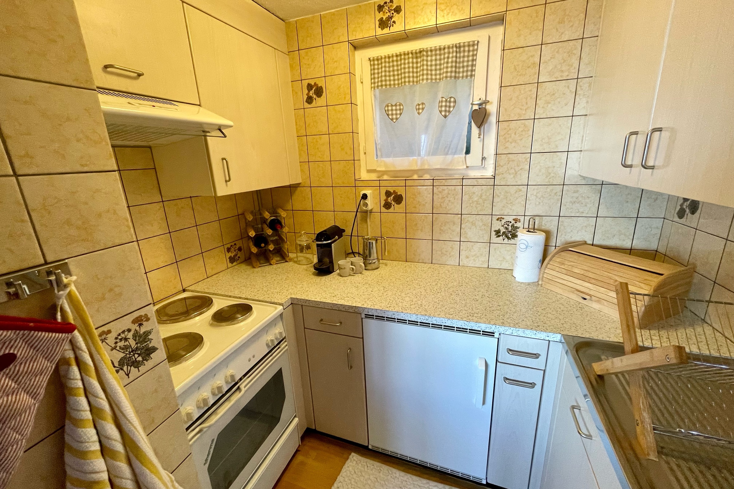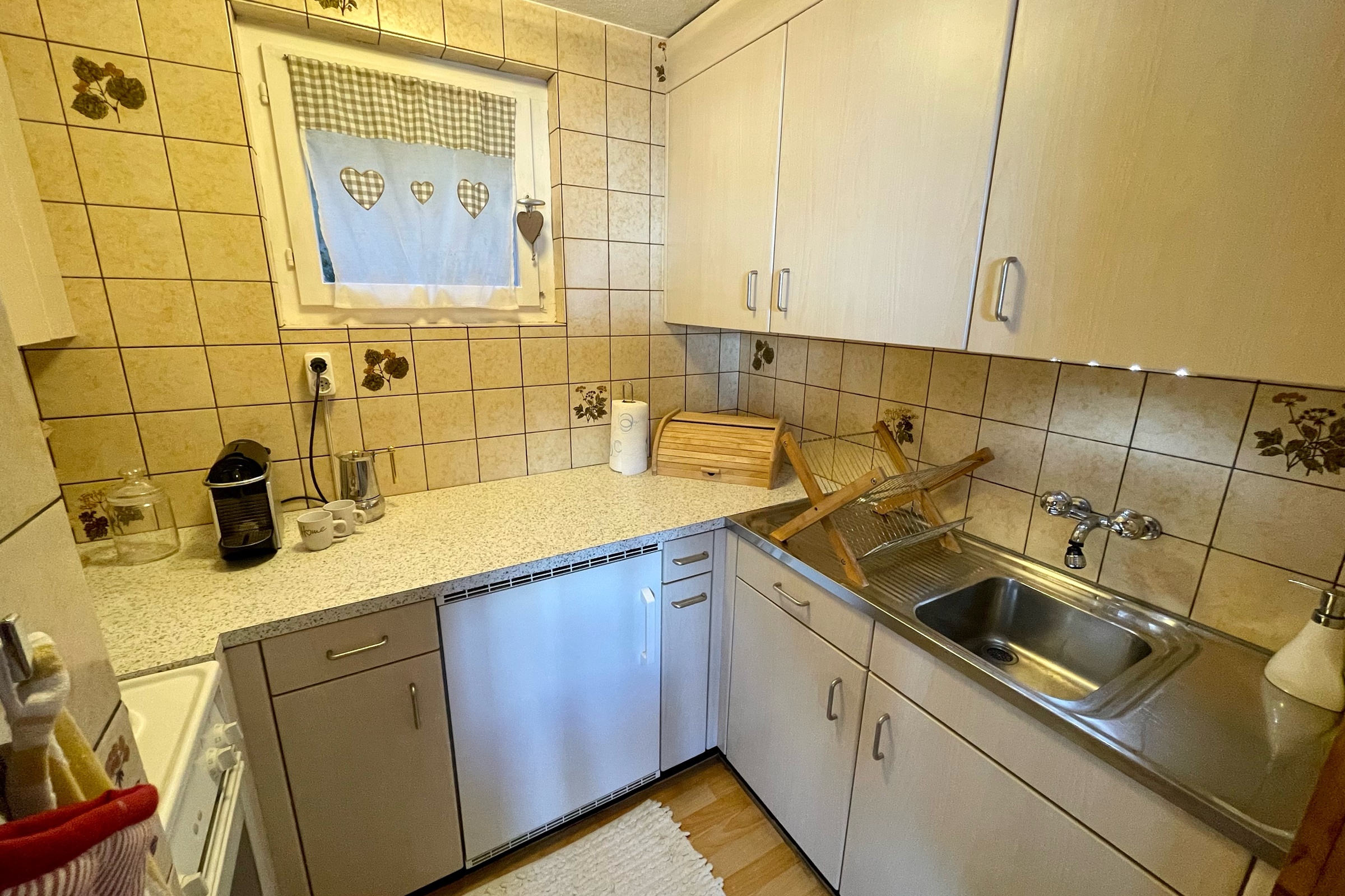 Die Küche verfügt über einen Elektroherd, Backofen, Toaster, Kaffeemaschine (Nespresso, Bialetti), Wasserkocher, Kühlschrank mit kleinem Gefrierfach, Fondue-Caquelon, Raclette- und Tischgrill-Ofen.Inneneinrichtung