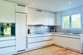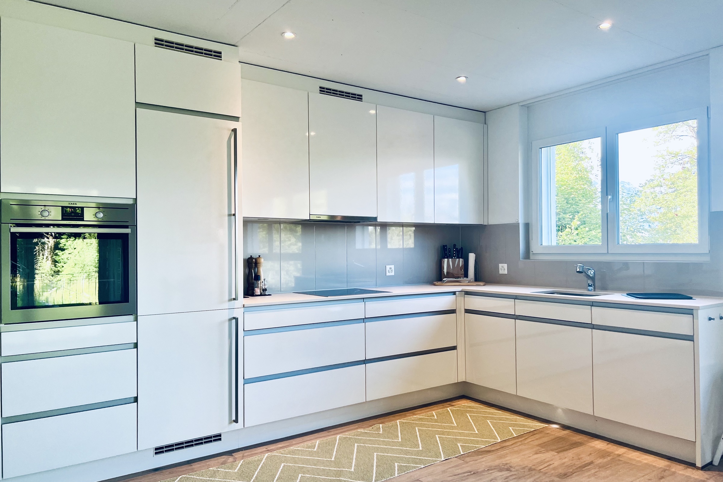 Die moderne Küche ist ausgestattet mit Kühlschrank, Gefrierfach, Kochherd, Backofen, Geschirrspüler, Toaster und einer Kaffeemaschine. Inneneinrichtung