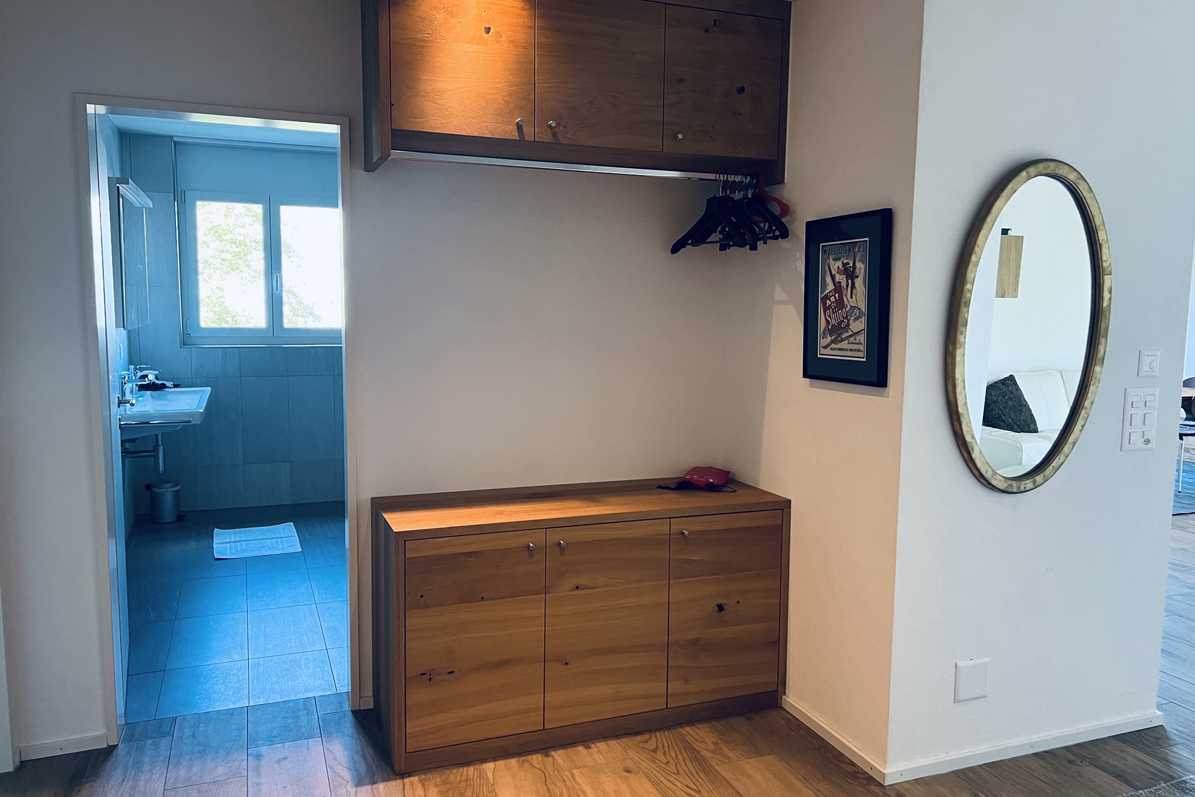 Die Ferienwohnung verfügt überzwei Schlafzimmer mit einem Doppelbett und einem Etagenbettein Badezimmer mit Dusche, WC und Lavaboein offener Wohn-/Essbereich mit Sofa, Cheminée, Esstisch und Stühleneine komplett ausgestattete KücheInneneinrichtung & Technik
