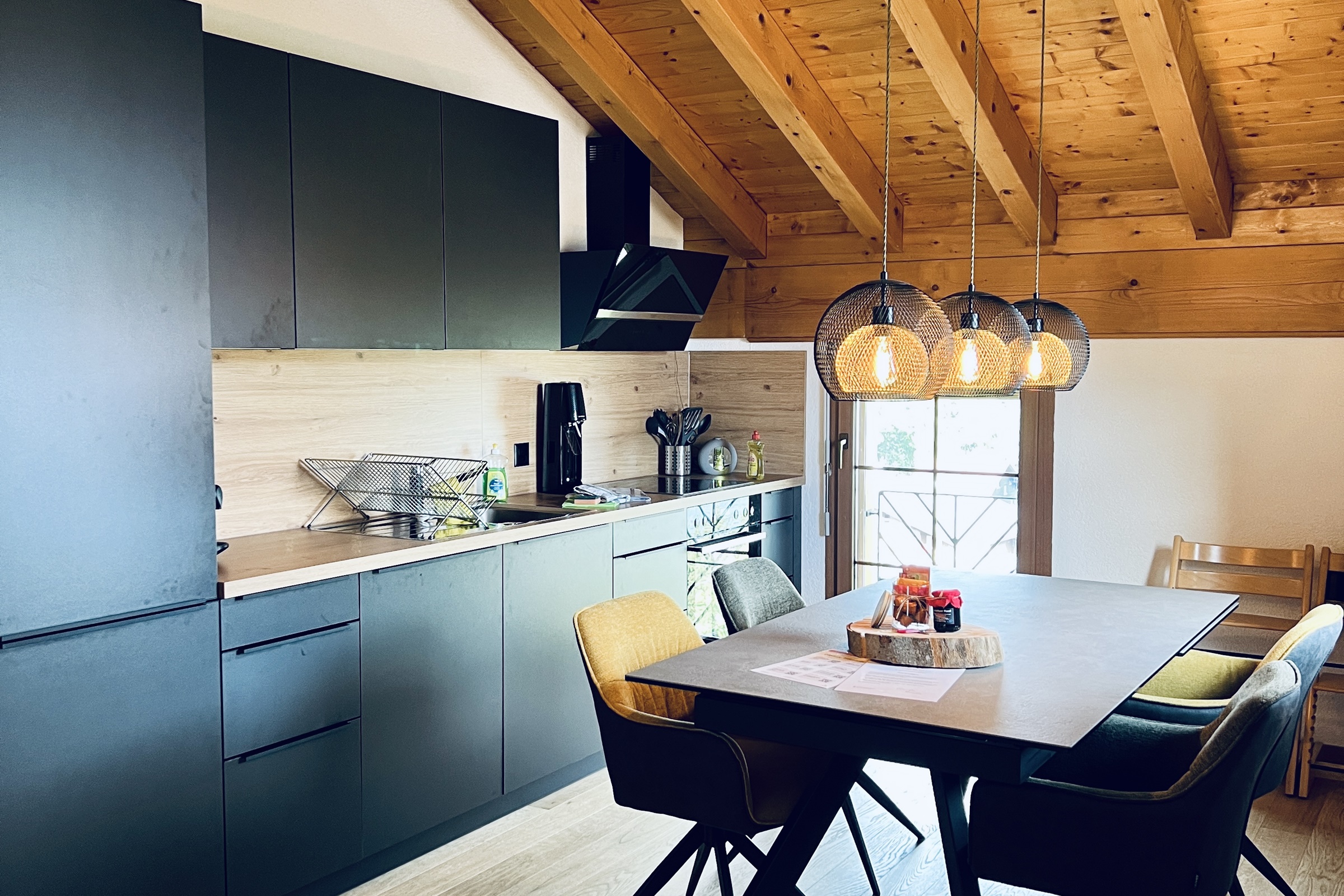 Die vollausgestattete Küche verfügt über einen Kochherd, Kühlschrank, Gefrierfach, Backofen, Kaffeemaschine, Geschirrspülmaschine und ein Soda Club. Inneneinrichtung
