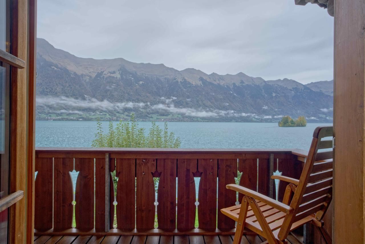Gemütliche 3.5-Zimmerwohnung für 4 Personen in Iseltwald – Balkon mit Aussicht über die markante türkisblaue Farbe des Brienzersee’s und die Berge.