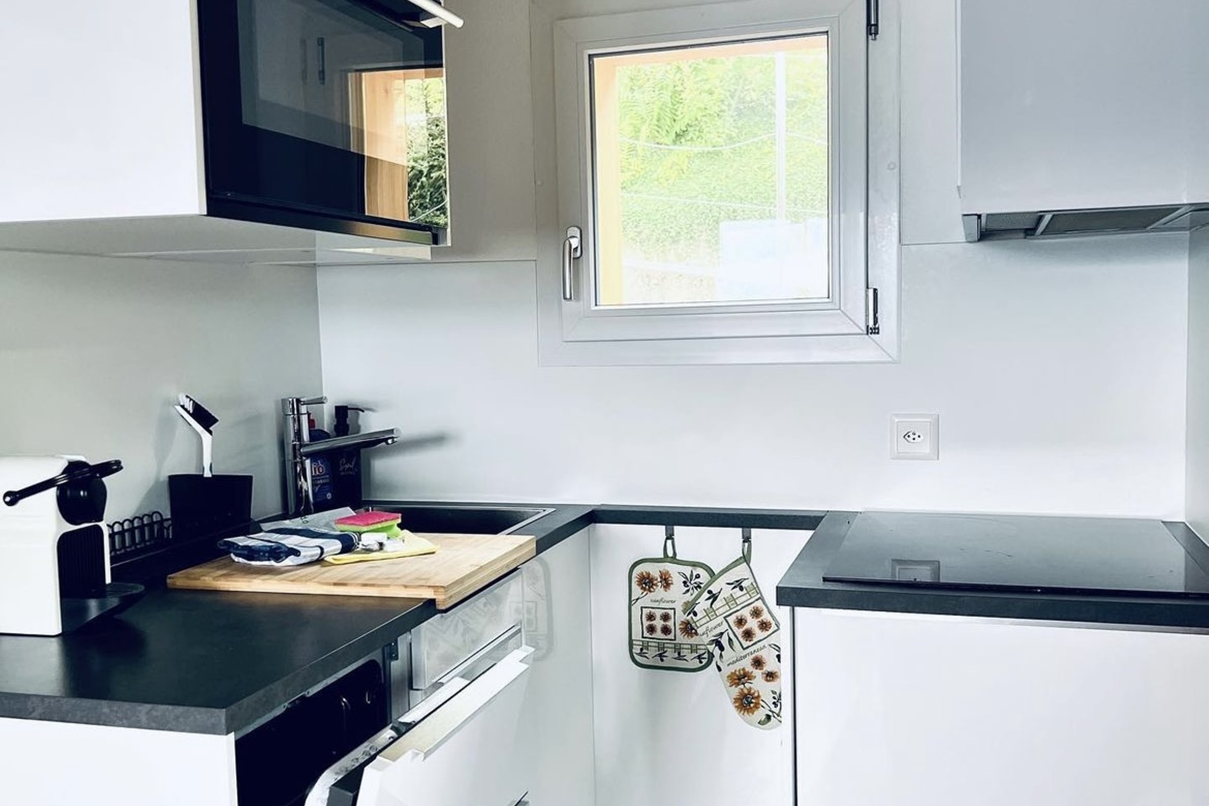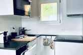 Offene, kleine aber moderne Kochnische (2017) mit Geschirrspüler, Keramikherd, Backofen, Mikrowellengerät und Kühlschrank.