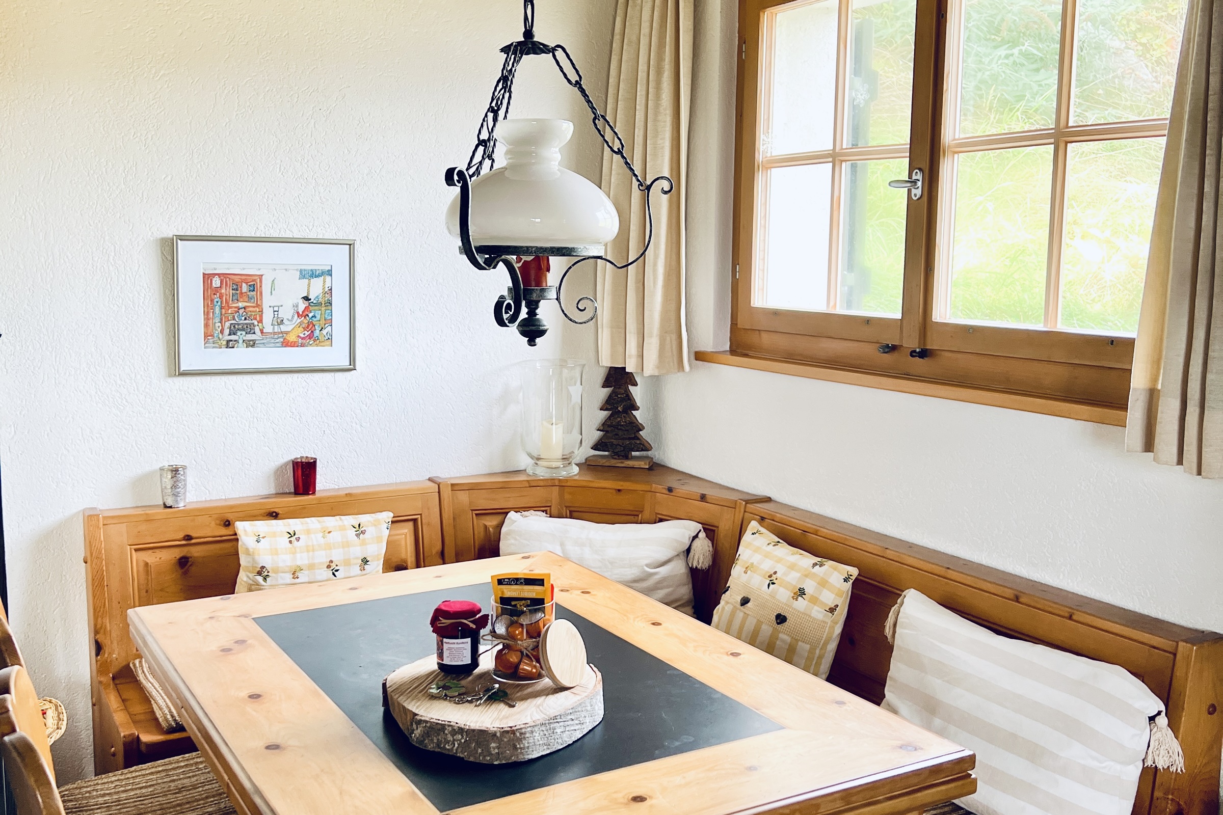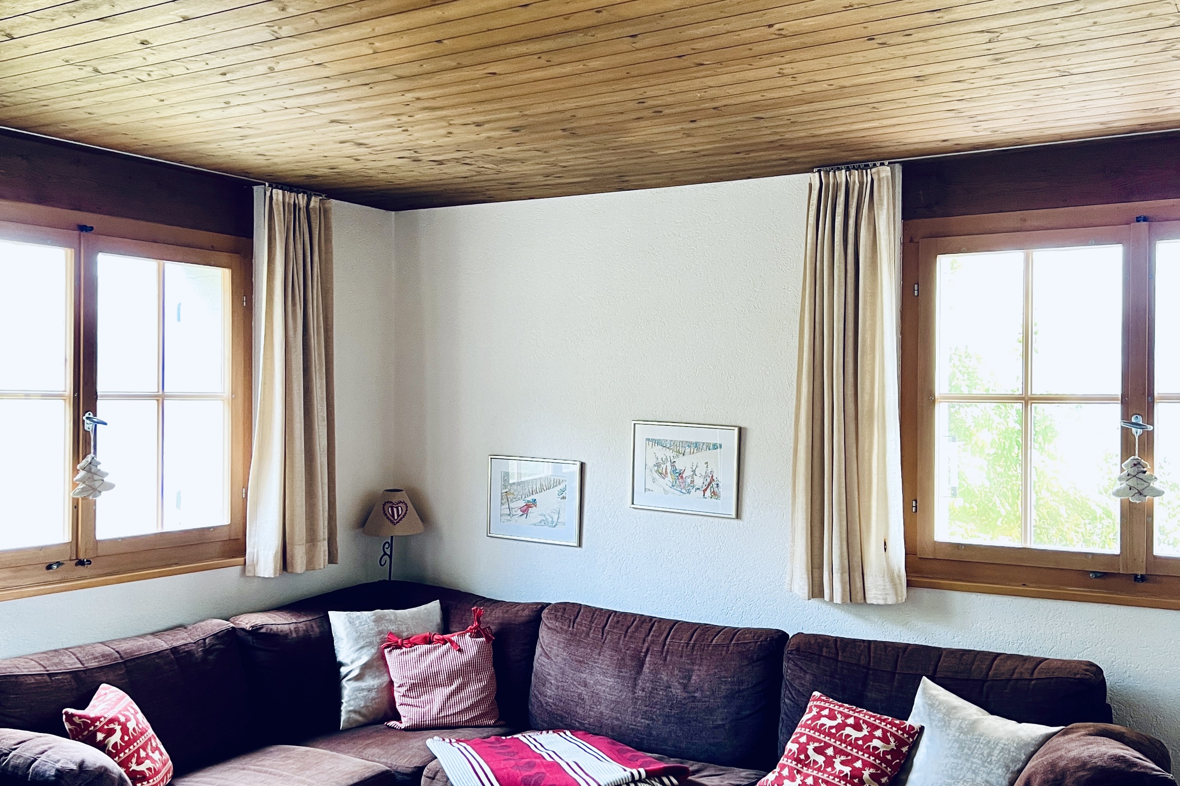Die 3.5 Zimmer-Maisonettewohnung verfügt über zwei Schlafzimmer mit jeweils 2 einzelnen Betten ein Badezimmer mit Dusche/WC, Haarföhn ein grosszügiges Wohnzimmer mit Sofa, Cheminée (Holz vorhanden) und Essbereich mit grossem Holztisch und Eckbank eine offene Küche mit Herd, Backofen, Kühlschrank, Tiefkühlfach, Kaffee-/Teekocher, Fondue- und Raclettegeschirr Inneneinrichtung & Technik