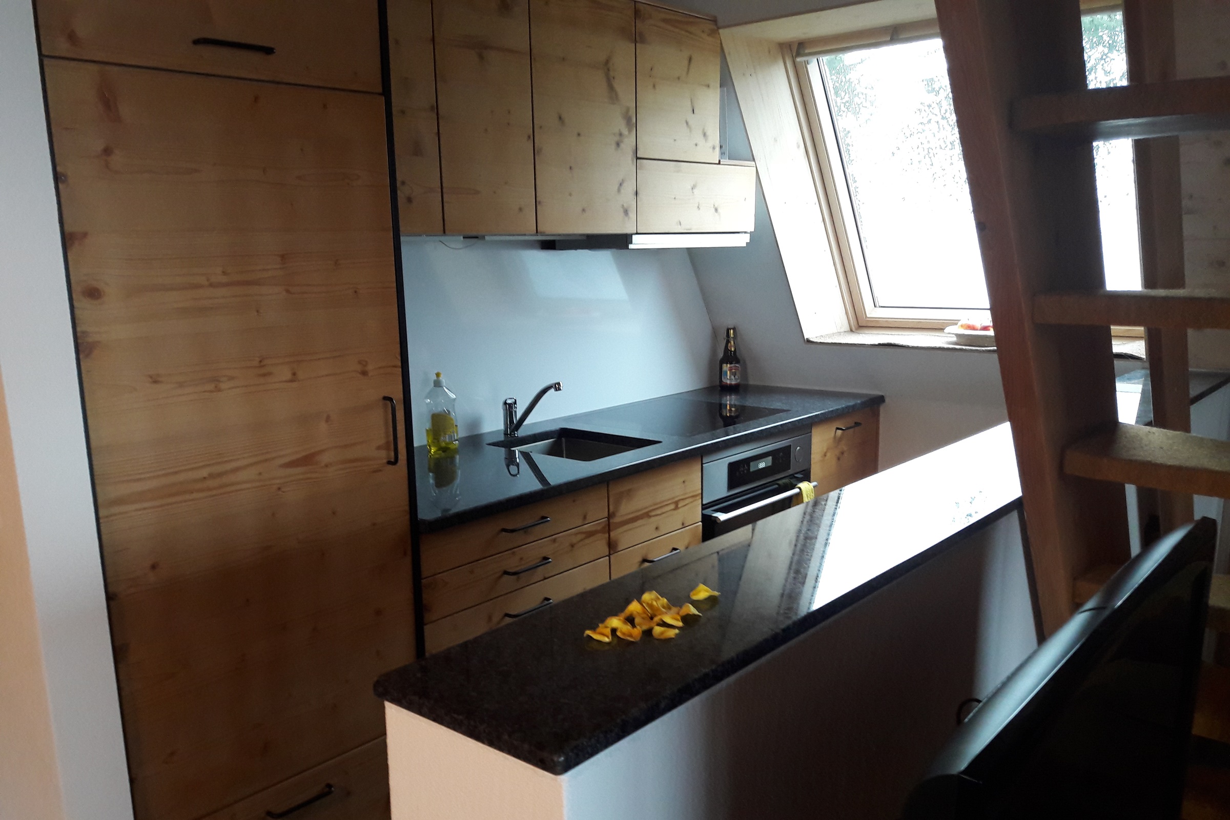 Die Wohnung ist heimelig mit viel Holz eingerichtet. Der Schwedenofen im Wohnbereich macht den Aufenthalt sehr gemütlich. Die ganze Wohnung verfügt über einen Teppichboden. Technische Einrichtung