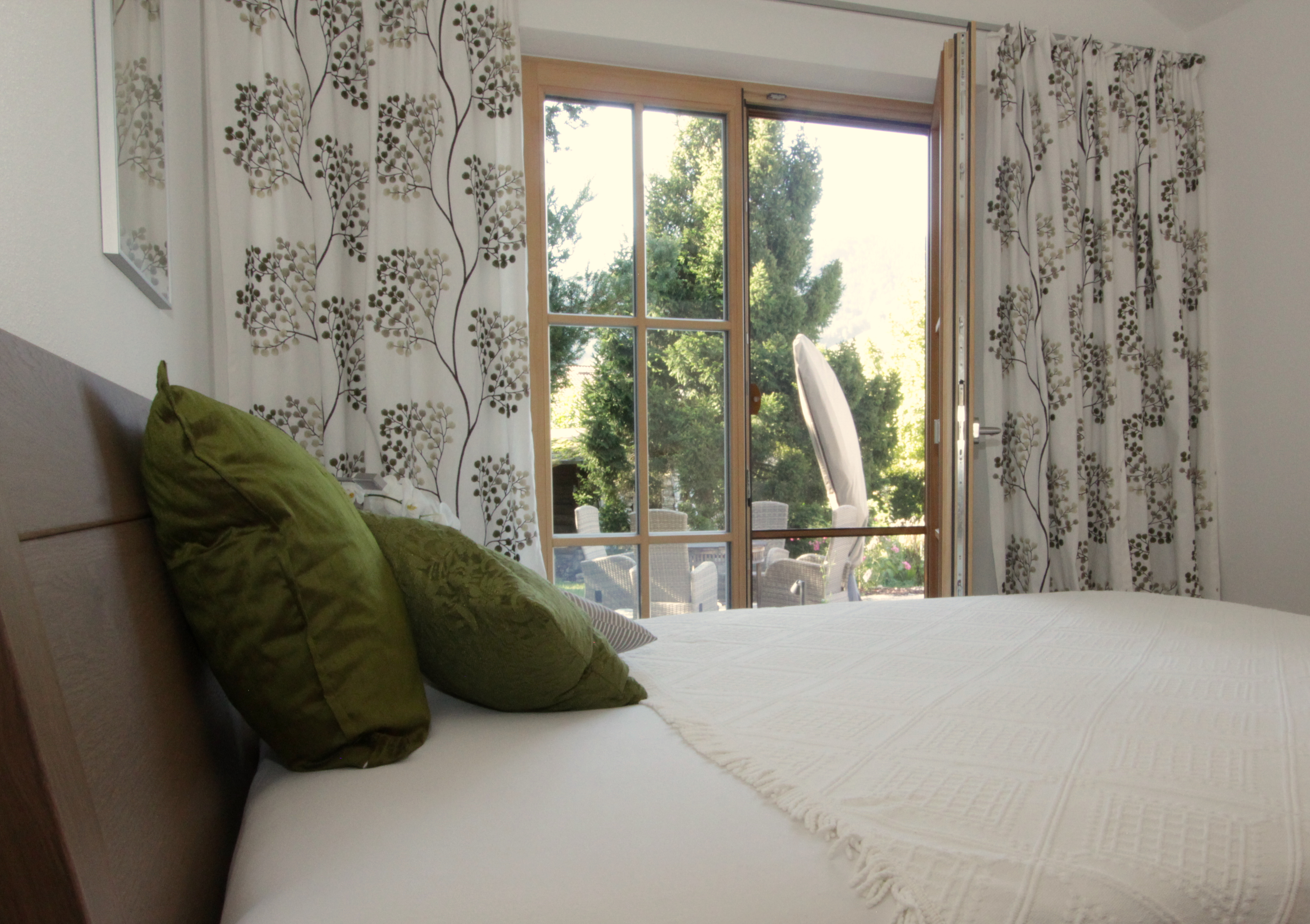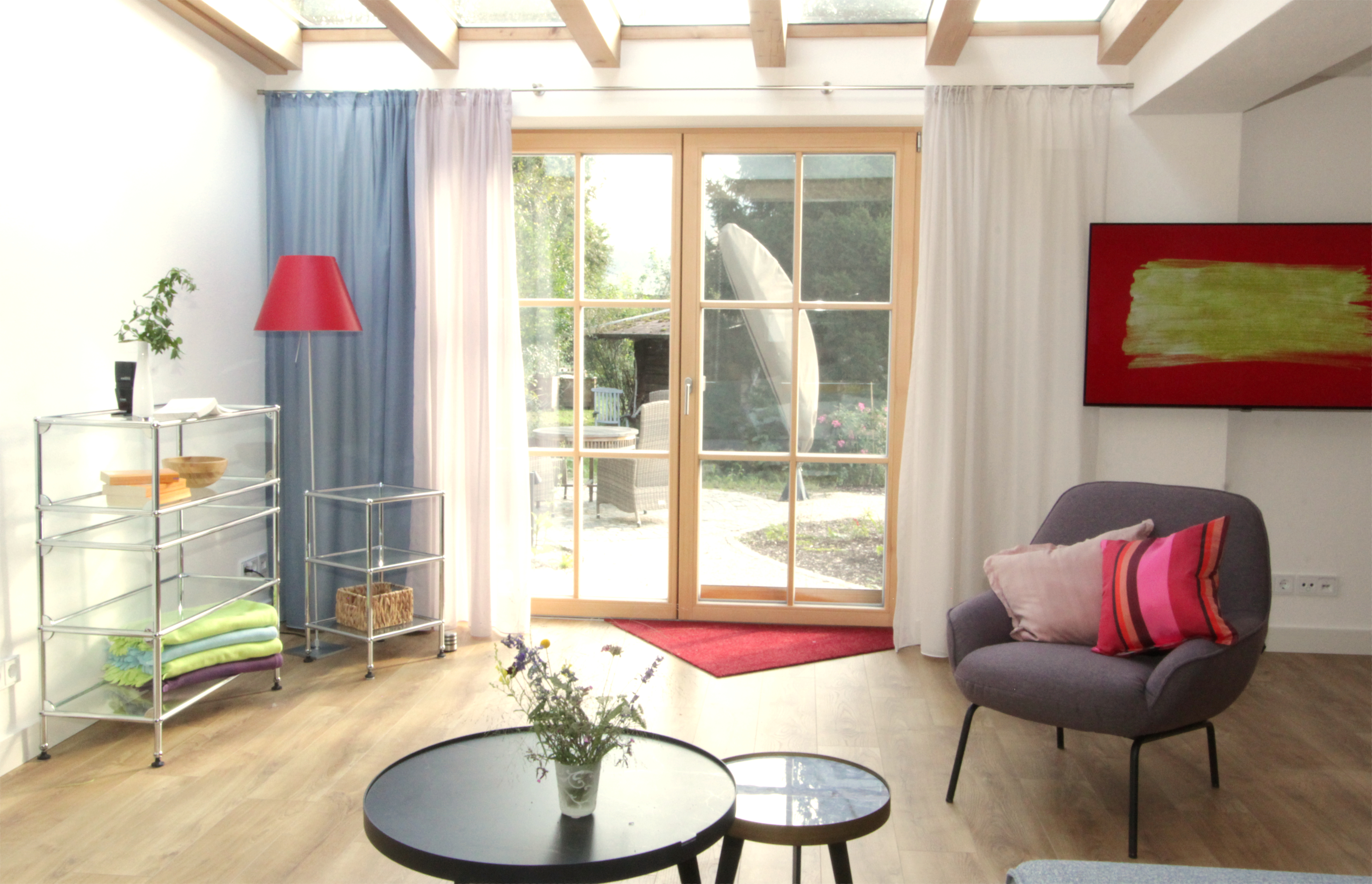 Sie erwartet eine elegante, moderne, barrierefreie und allergiefreundliche nach Süden ausgerichtete de luxe Ferienwohnung auf einem sehr großen parkähnlichem, an einen Hain erinnernden, gestalteten Garten mit vielen insektenfreundlichen Blumen, Ziersträuchern, Bäumen und einer wunderschönen einladenden Terrasse.  Ein besonderes Highlight ist der freie Blick auf die Chiemgauer Alpen mit der Bergkette: Hochplatte, Geigelstein und Breitenstein.