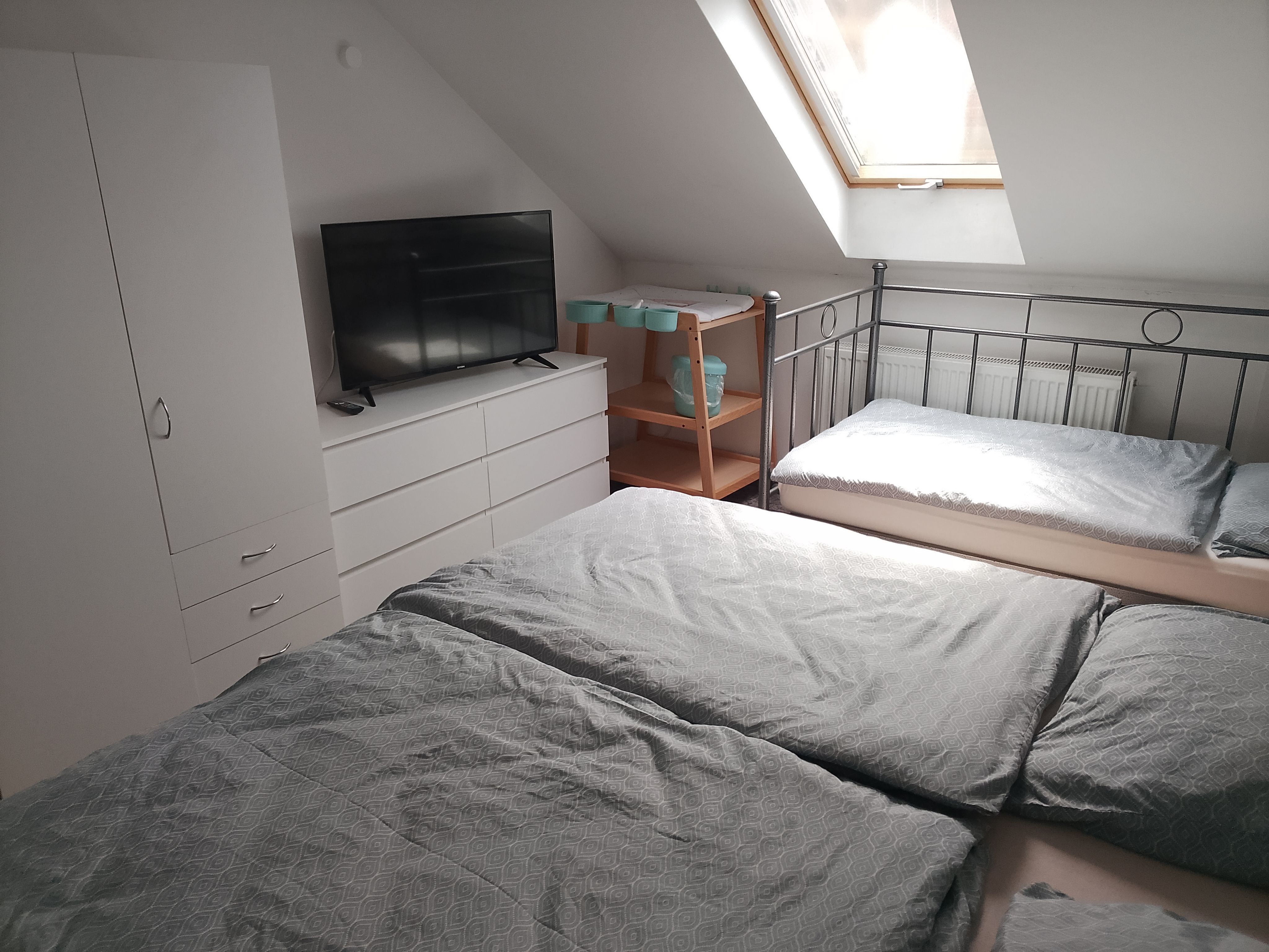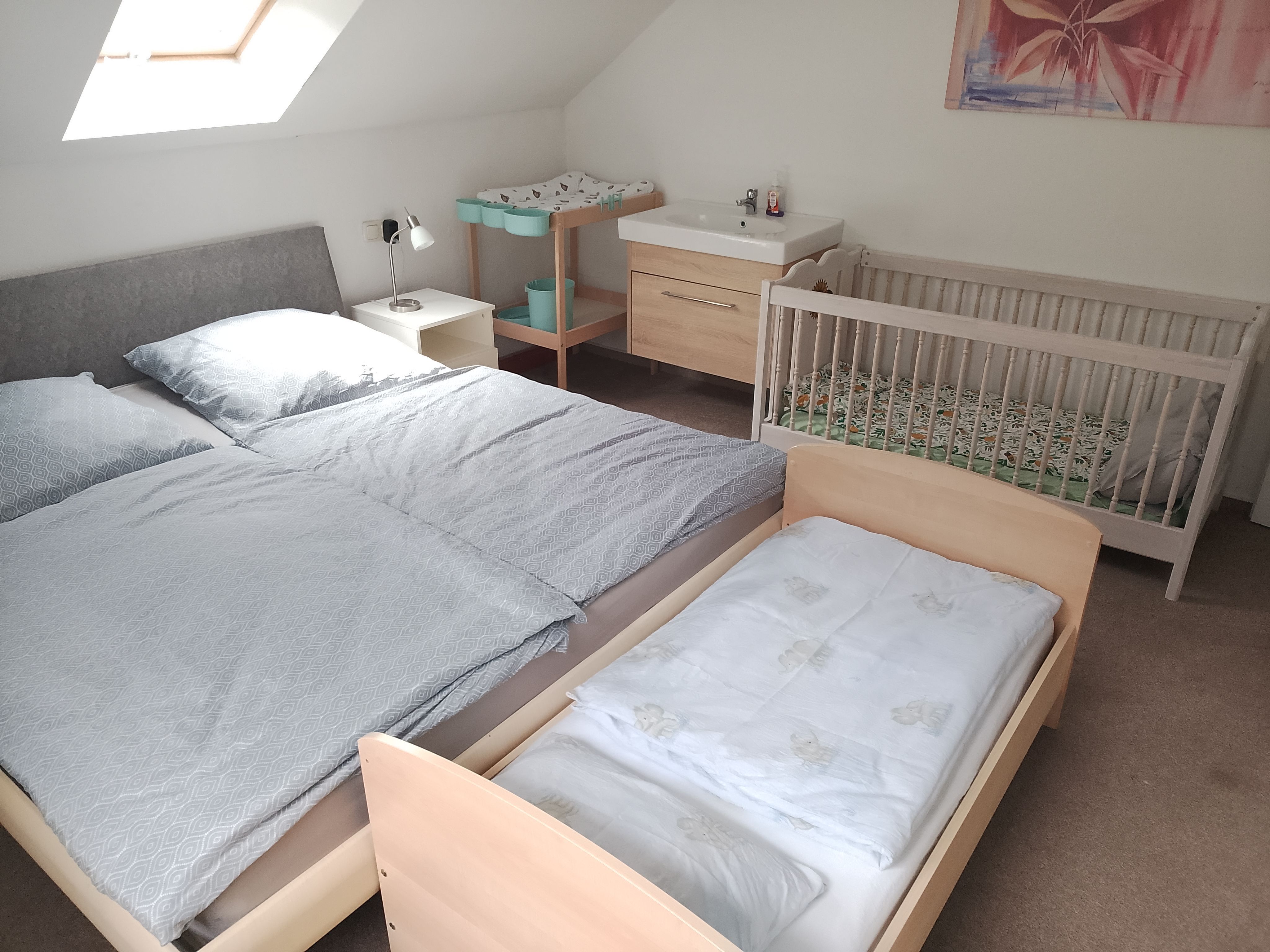 In der Ferienwohnung befinden sich insgesamt zwei Babybetten und ein Kinderbett.