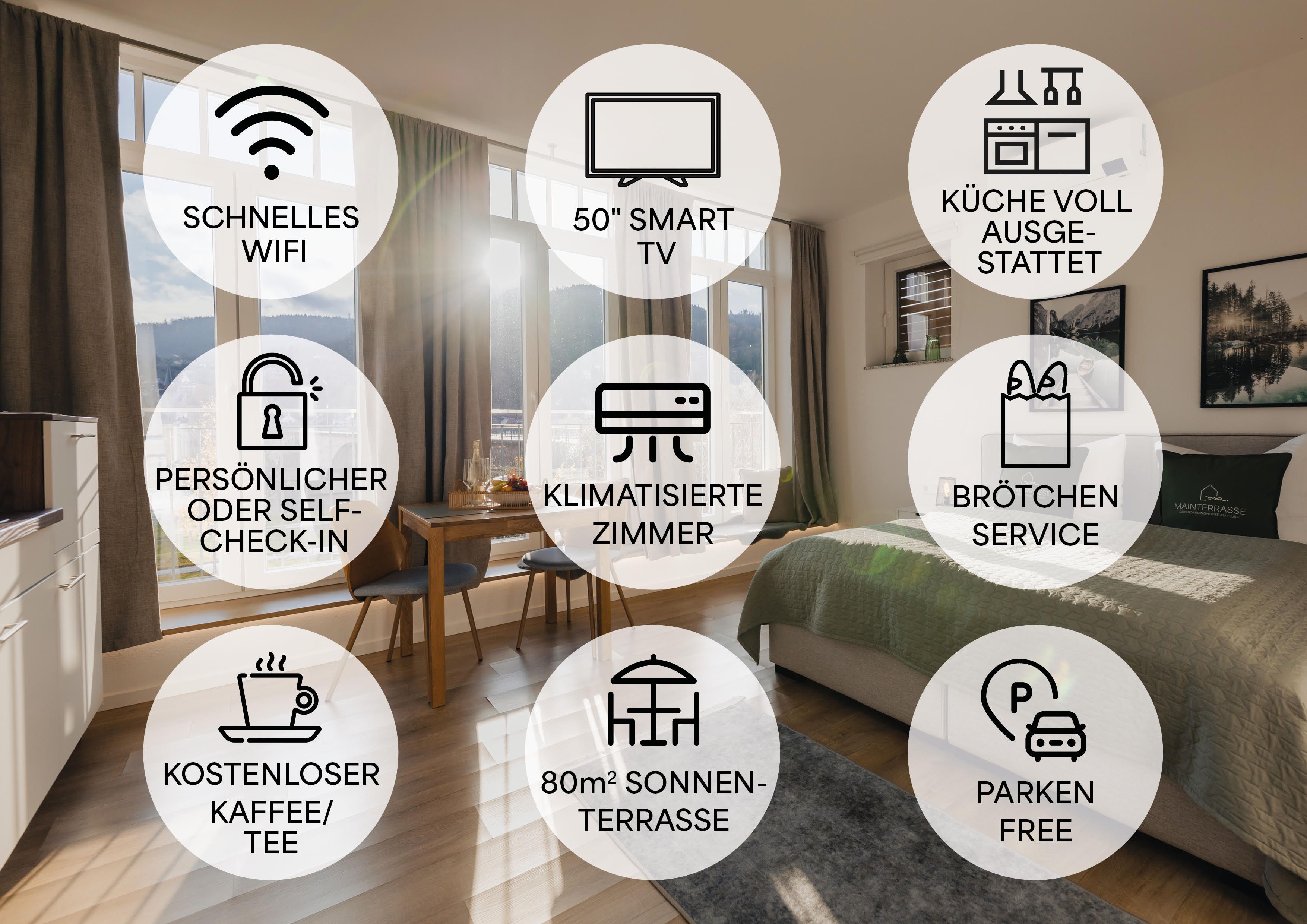Das klimatisierte 32,5m² große Apartment, welches zwei Gäste beherbergen kann, verfügt über ein 1,8mx2m Boxspringbett, einen 50 Smart TV, eine Küchenzeile mit Kühlschrank, Herd, Waschbecken und Geschirrspüler. Ein modernes und großzügiges tageslicht Badezimmer mit XL Dusche und Rainshower Funktion, sowie WC und Fön.