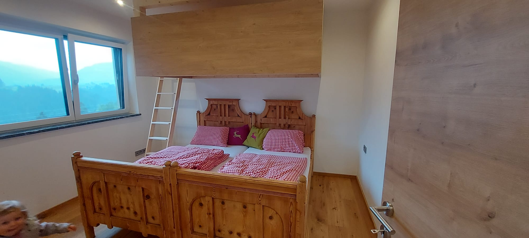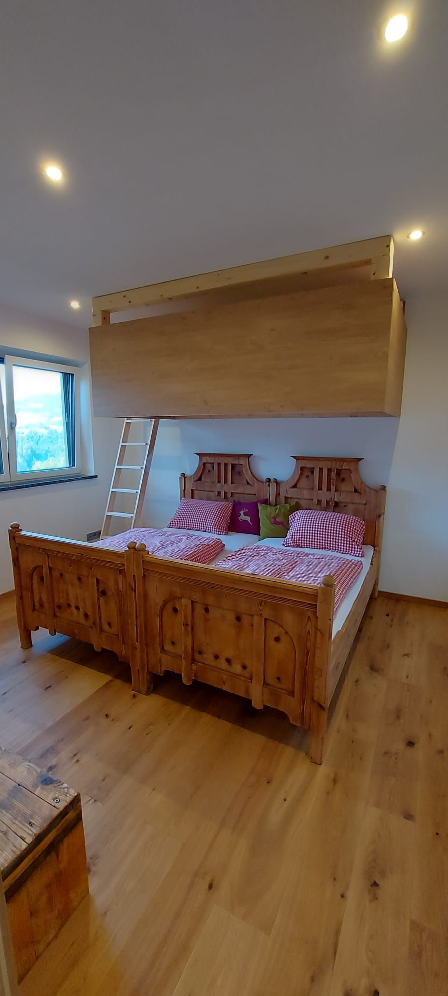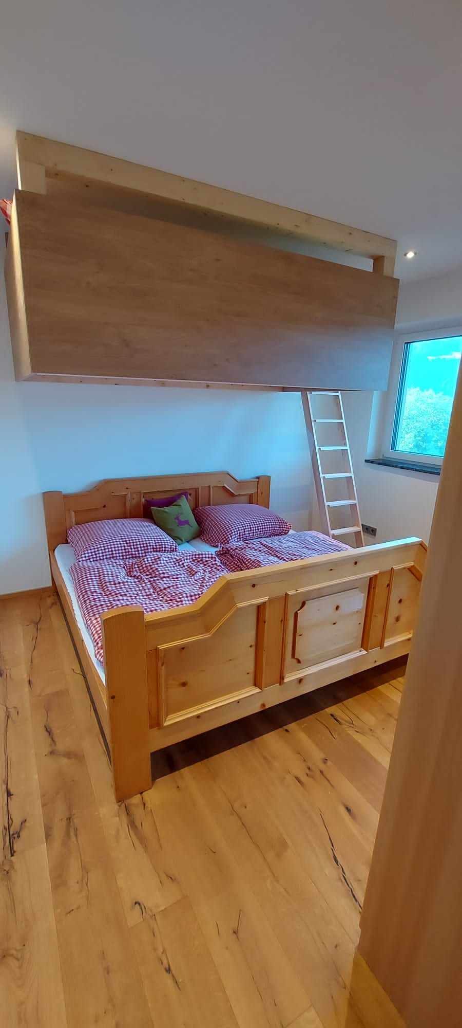 • ein Schlafzimmer mit einem Zirbenbett und einem Stockbett für 1-2 Kinder oder einen Erwachsenen