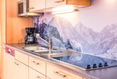 Kühlschrank mit Gefrierfach, Mikrowelle, Cerankochfeld (4 Platten), Geschirrspülmaschine, Toaster, Wasser- und Eierkocher, Kaffee-Filtermaschine, Kaffee Kapselmaschine (Caffissimo), Mixer, Rührstab, sowie ausreichend Geschirr, Gläser, Kochtöpfe und Pfannen.