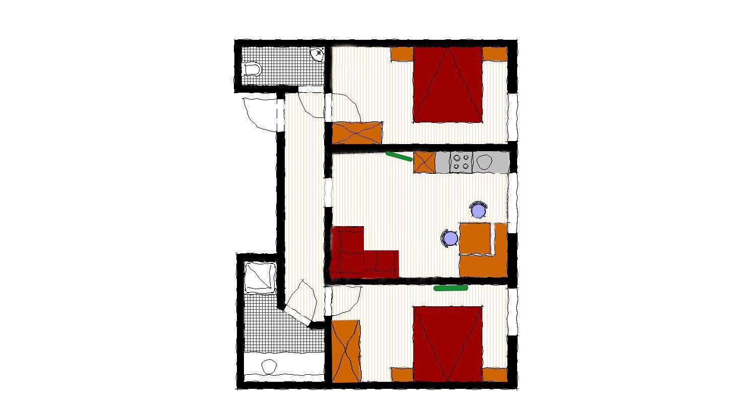 Großzügige Ferienwohnung mit 2 getrennten Schlafzimmer, Wohnküche mit Ecksofa, Dusche/WC (Haarfön vorhanden) und Waschtisch, sep. WC, WLAN