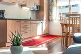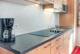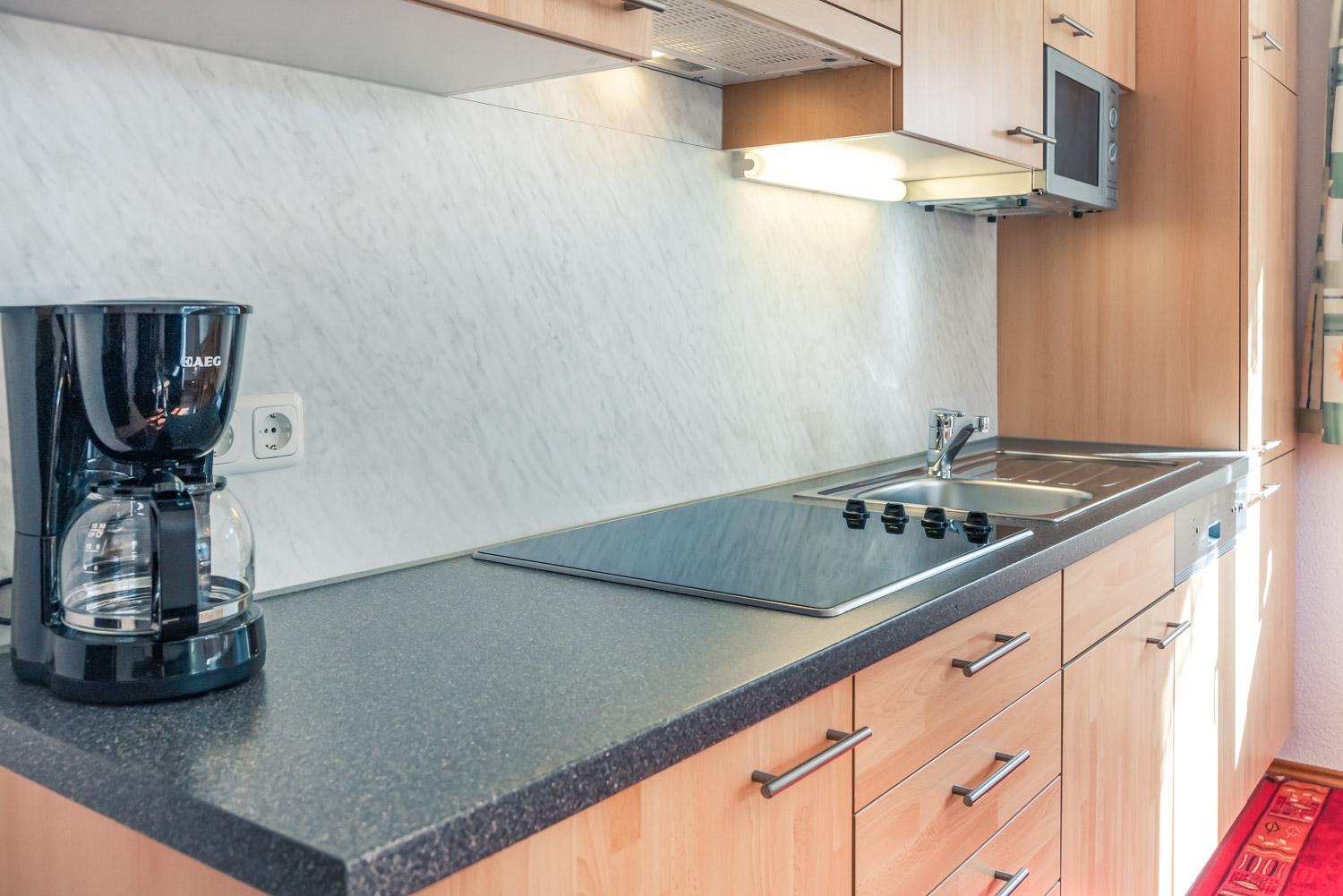 Kühlschrank mit Gefrierfach, Mikrowelle, Cerankochfeld (4 Platten), Geschirrspülmaschine, Toaster, Wasser- und Eierkocher, Kaffee-Filtermaschine, Kaffee Kapselmaschine (Caffissimo), Mixer, Rührstab, sowie ausreichend Geschirr, Gläser, Kochtöpfe und Pfannen.