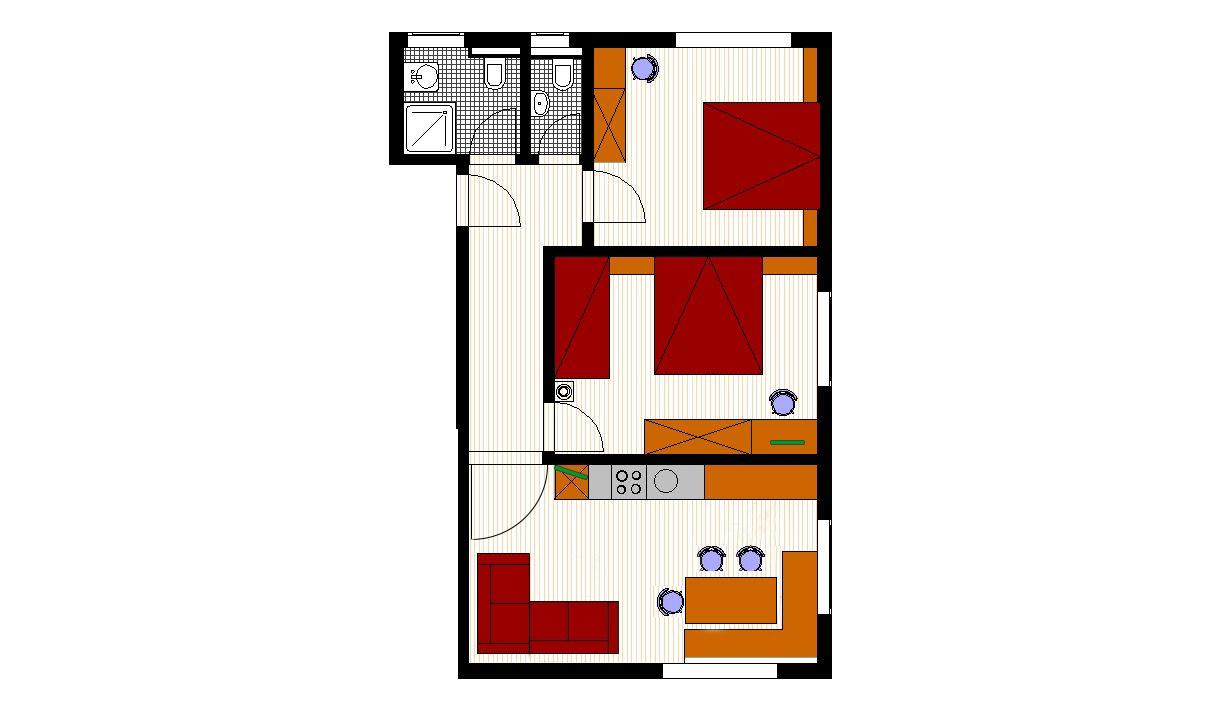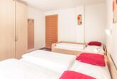 Geräumige Wohnung mit 1 Doppel- und 1 Dreibettzimmer, Dusche/WC (mit Haarfön), sep. WC, große, helle Wohnküche.