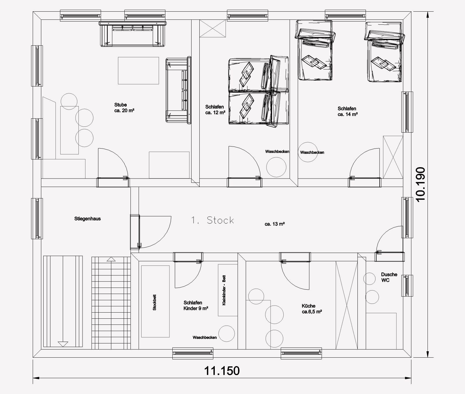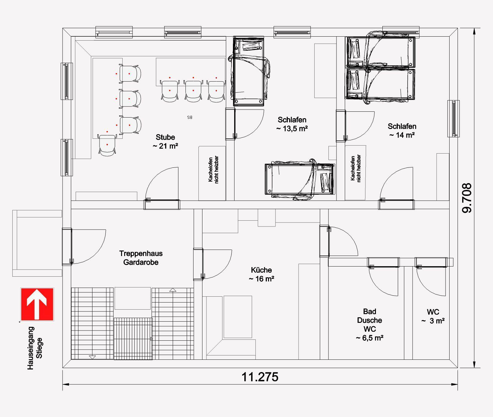 • 1 Mehrbettzimmer (Stockbett und kleineres Bett aber nur als Kinderbett geeignet)