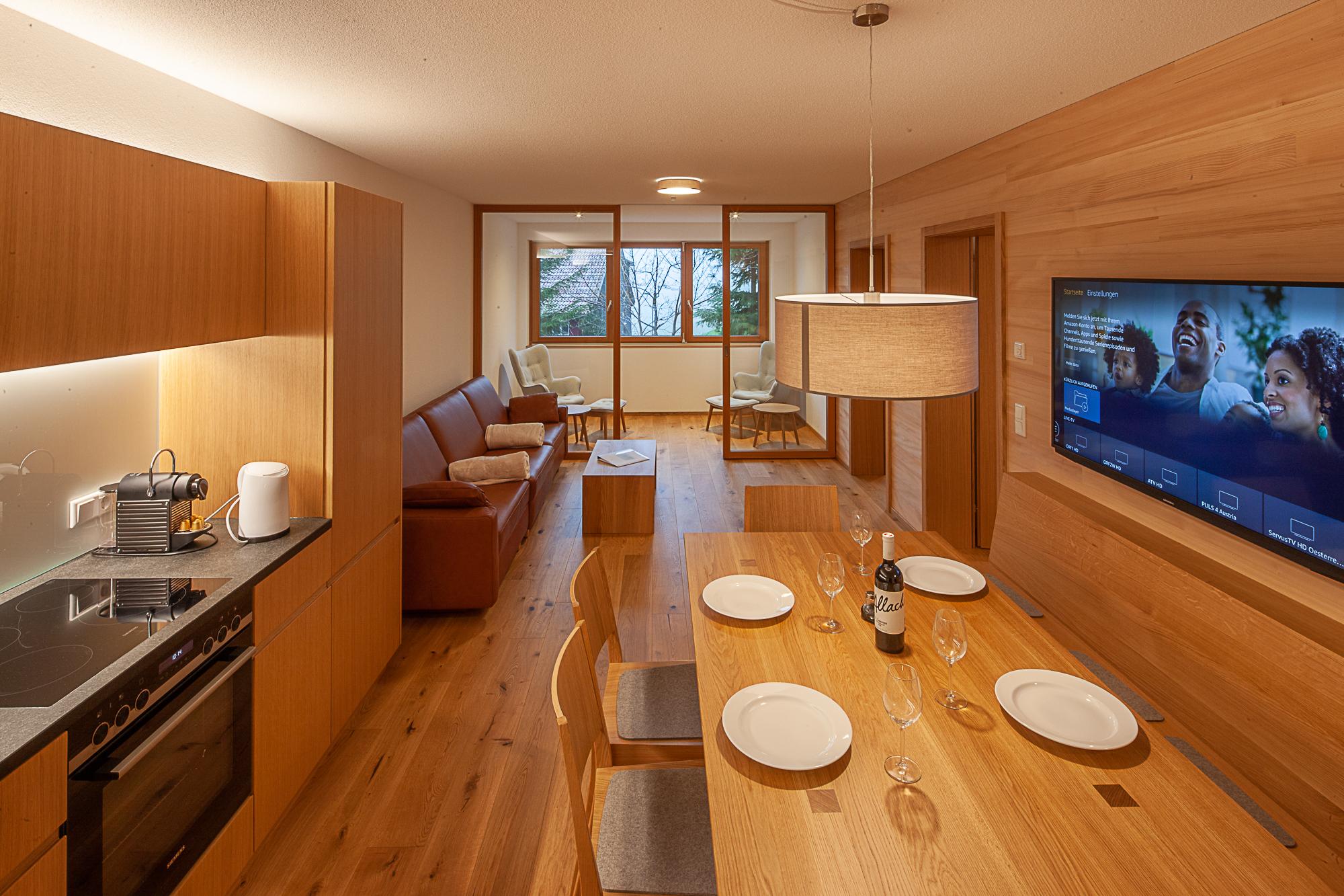 Bestehend aus einem Wohnraum mit Küche, Esstisch, Couch und TV.