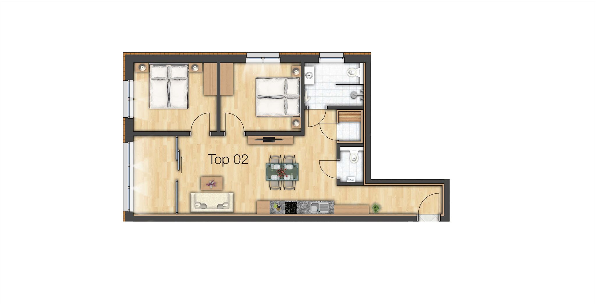 Das Appartement hat 2 Schlafzimmer mit je einem Doppelbett.