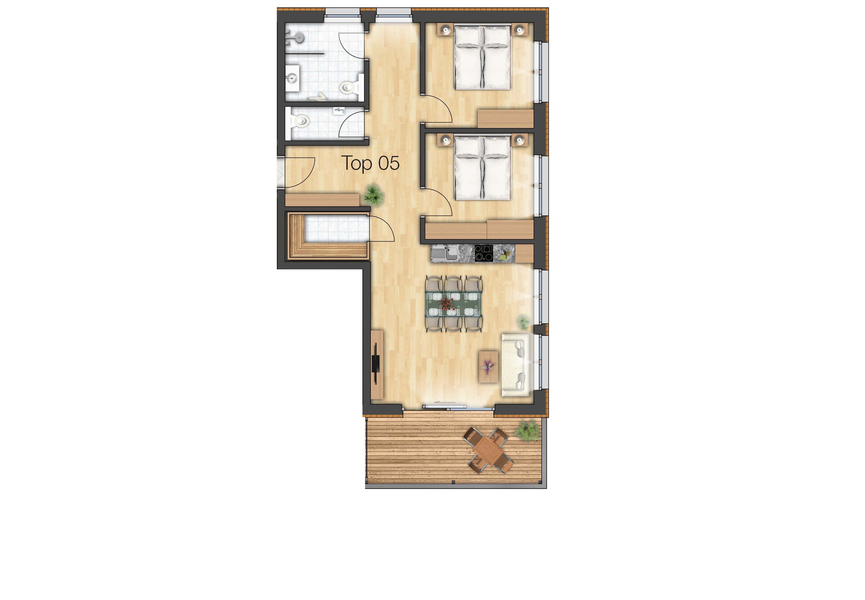 Das Appartement hat 2 Schlafzimmer, mit je 1 Doppelbett.