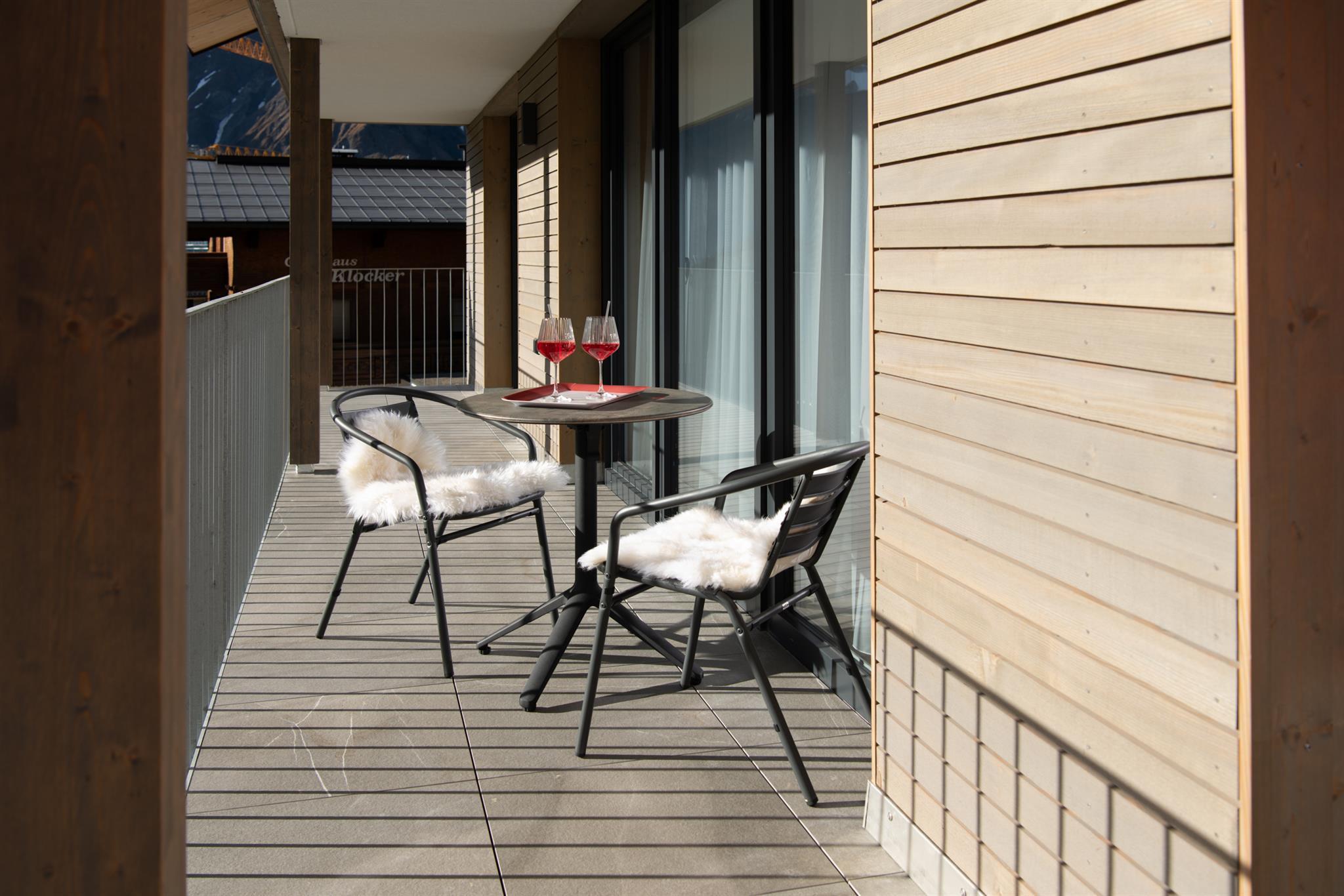 Überdachter Südbalkon mit Sitzmöglichkeit