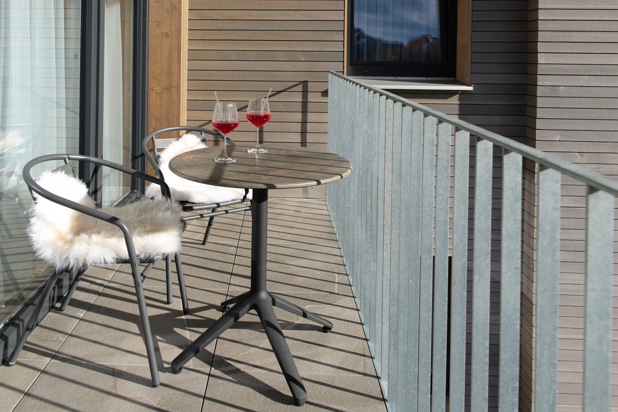 Überdachter Südbalkon mit Sitzmöglichkeit