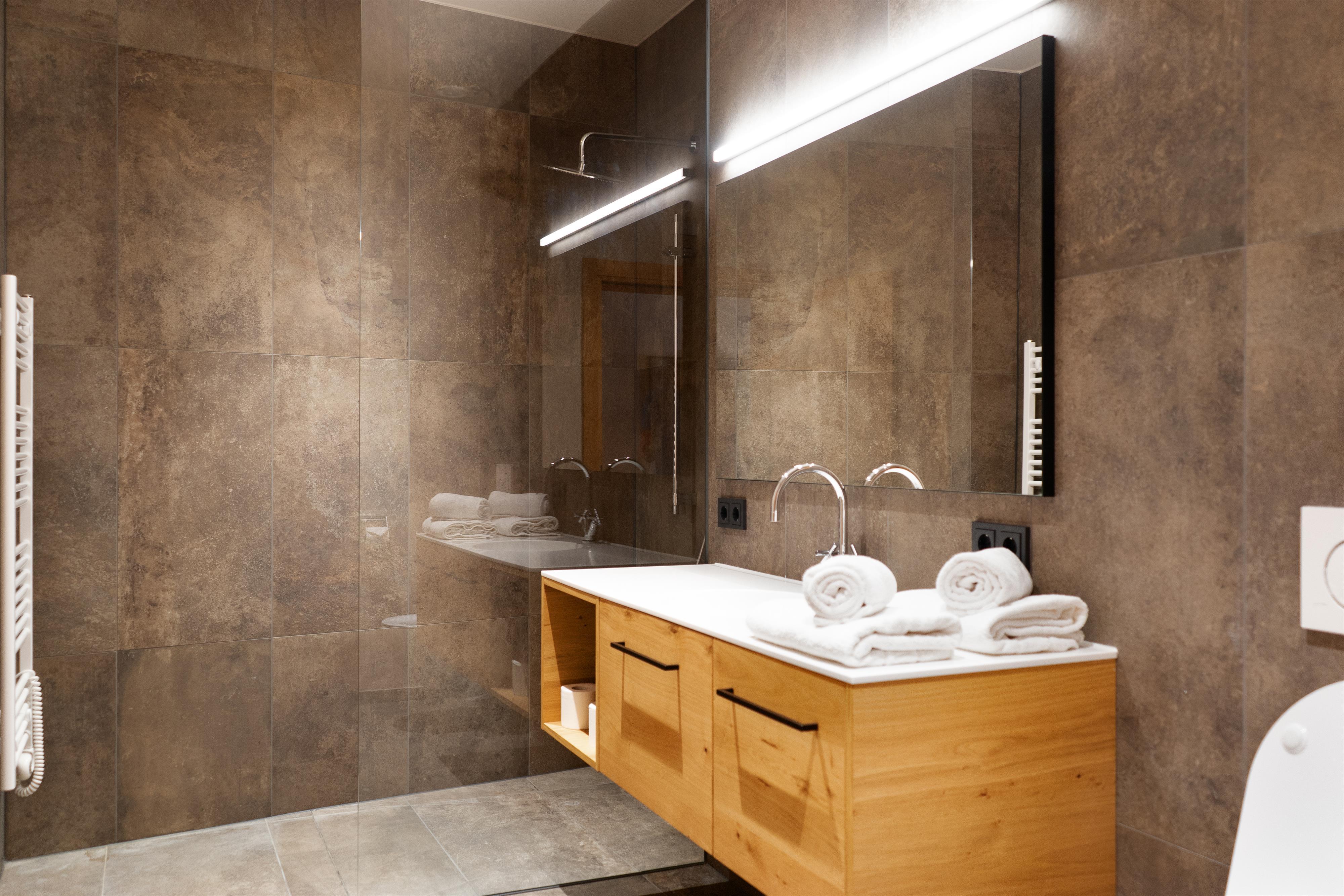 Auf exquisiten bis zu 103 m 2 Wohnfläche verfügen die Apartments über 3 Schlafzimmer, kostenloses WLAN, min. einen Smart-TV und einen Schranktresor. Die Küche ist mit Backofen, Induktions-Kochfeld, Geschirr, Koch-Utensilien, Kaffeemaschine, Wasserkocher und Toaster voll ausgestattet. Die Suites haben Zugang zu einem Balkon/einer Terrasse. Vielfach sind die Badezimmer direkt über ein Schlafzimmer erreichbar und jeweils mit einer Badewanne oder Regendusche und Toilette ausgestattet. Die Gästetoilette ist in einem separaten Raum untergebracht. Ihr Auto stellen sie sicher in der dazugehörigen Tiefgarage ab, wo auch Ladestationen für E-Autos zur Verfügung stehen. Im Resort befindet sich ein Lift, sowie eine Waschküche mit Waschmaschine und Trockner. Kulinarisch umsorgt werden unsere Gäste mit unserem Frühstücksangebot, Brötchen- und Kühlschrankservice, sowie über den Automatenshop, der regelmäßig mit frischen Speisen unseres Haubenkochs A. Shala befüllt wird.