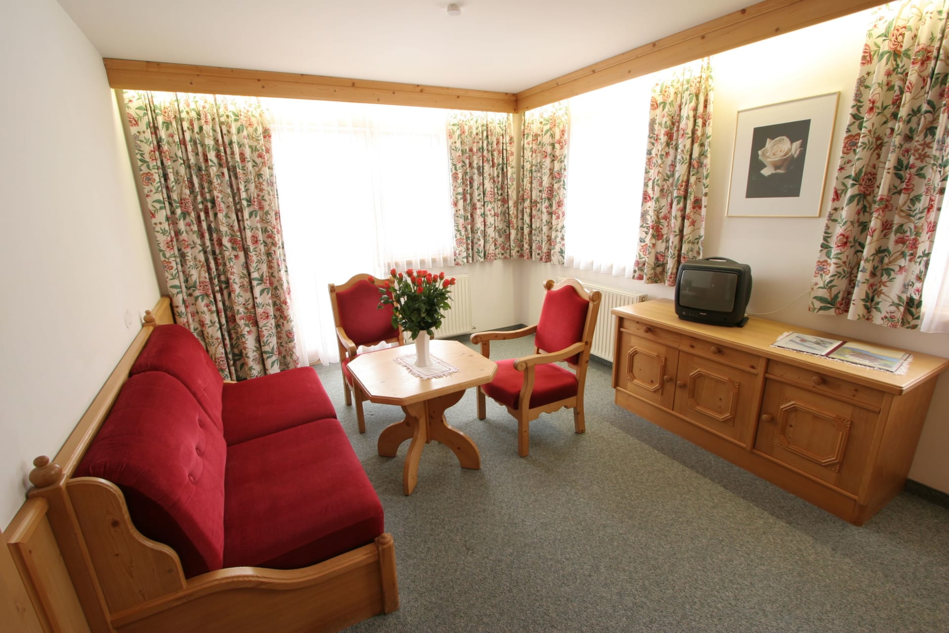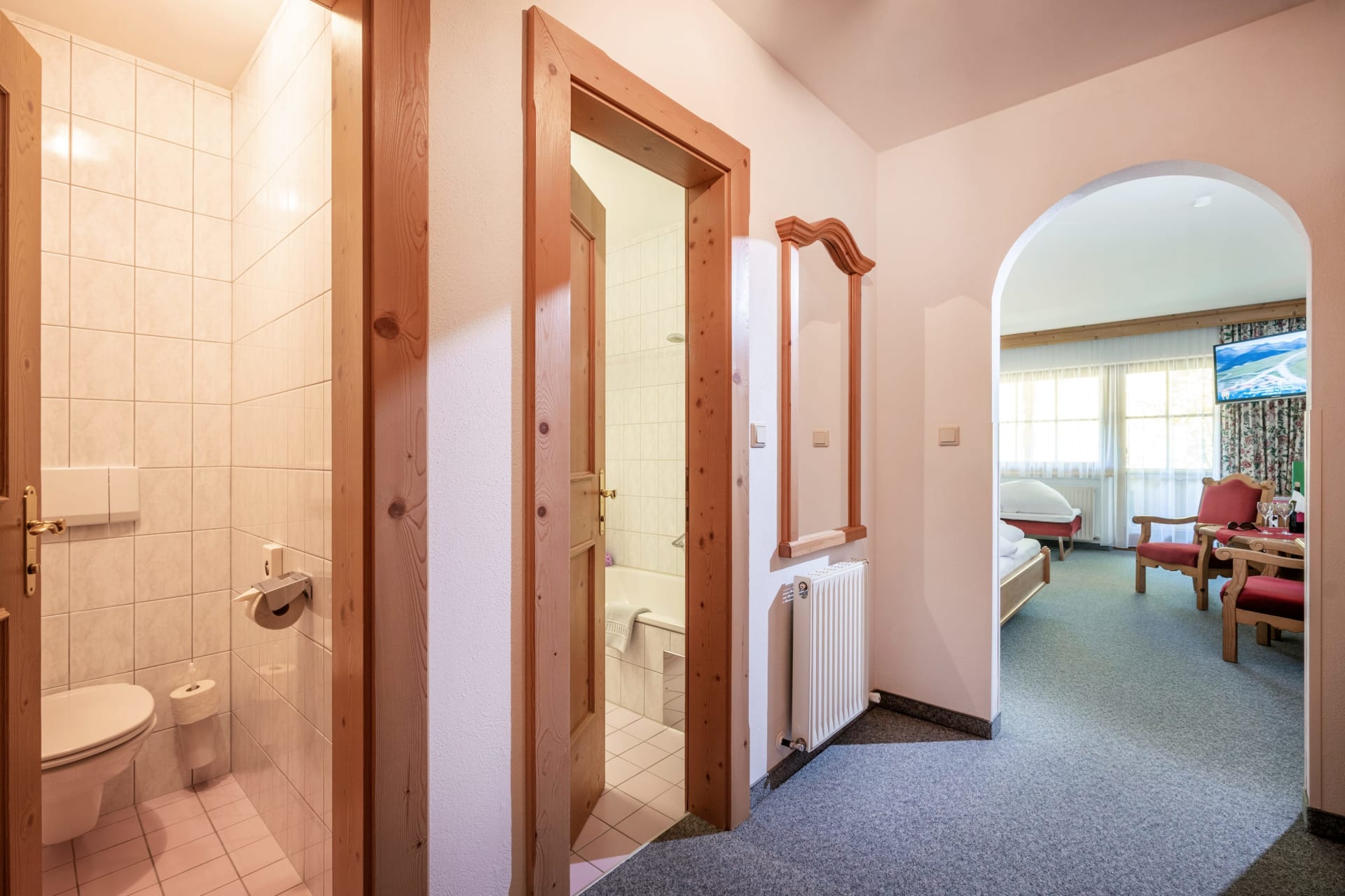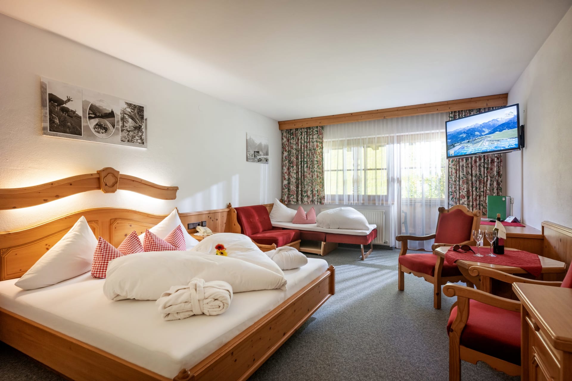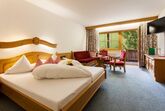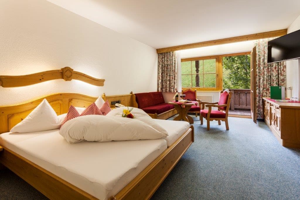 Junior Suite 33m² Familienzimmer, ohne Zwischnetür, mt/ohne Ercker, 2-4 Personen möglich, Bad mit Duschwand, Kosmetikspiegel, Bademantel, WC getrennt, Wohnsitzecke (2x Couchbett), Telefon (intern), WLan, Kabel-TV, Radio, Safe und Balkon.