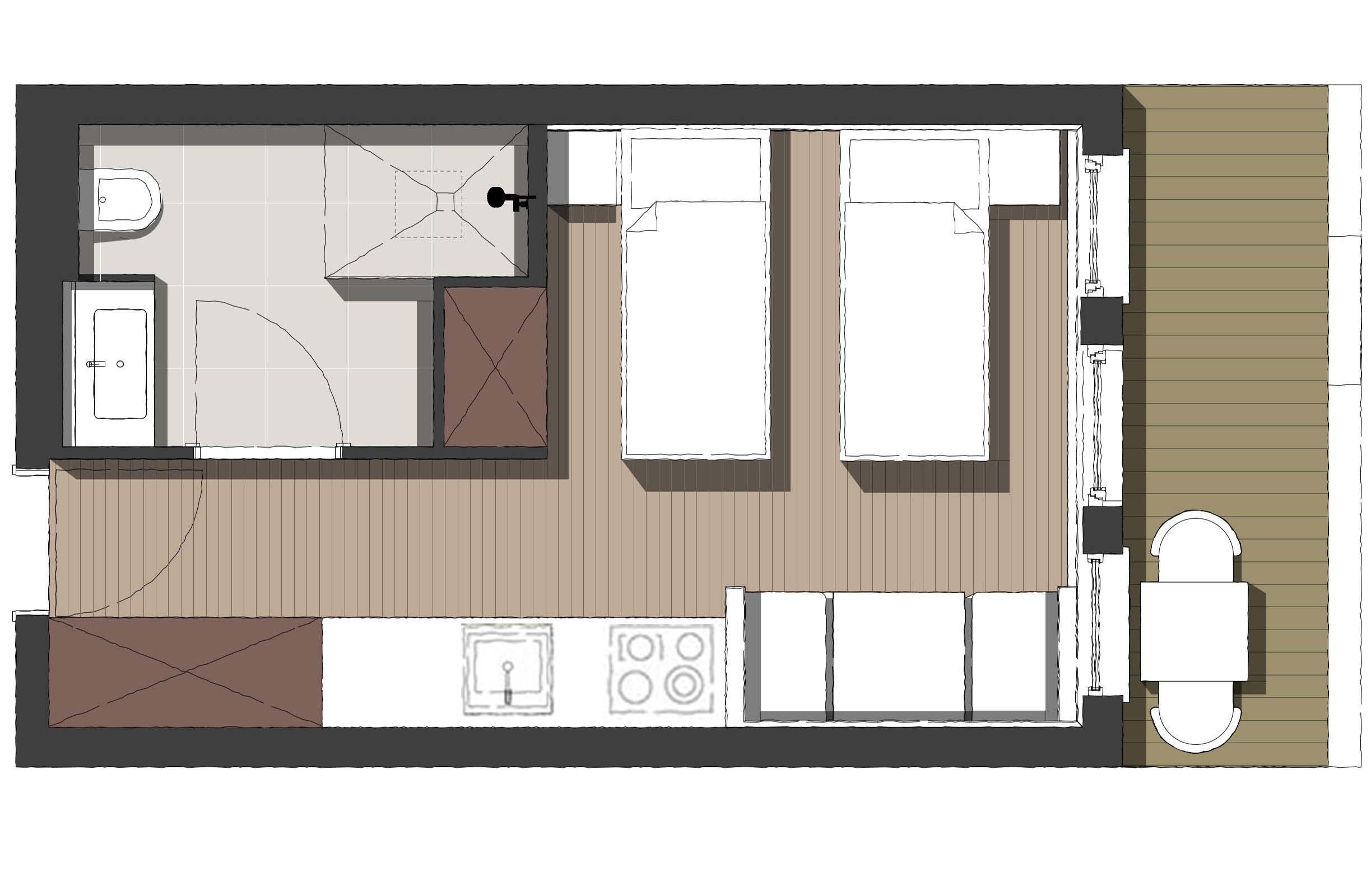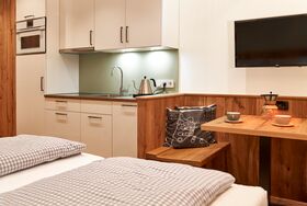 25m² stylisches Studio mit Terrasse; teilbare Boxspringbetten (2 x 90x200cm) dienen tagsüber als Sofa mit Kuscheldecken; top ausgestatte Küchenzeile: mit zwei Cerankochfeldern, Geschirrspülmaschine, Kombi-Dämpfer; sollte trotzdem was fehlen für die Zubereitung eines tollen Menüs: an der Rezeption gibt es fast alles zum Ausleihen! Esstisch mit zwei Sitzbänken; Flachbildschirm-TV und Safe; dazu separates, geräumiges Bad mit Dusche/WC inkl Fön und Duschseife;