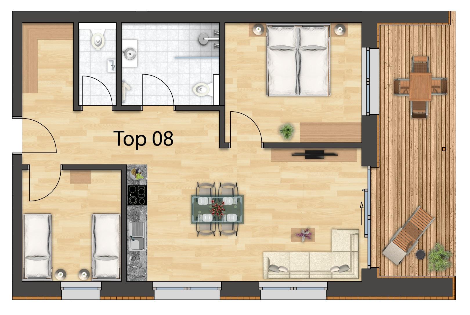 Bestehend aus einem Wohnraum mit Küche, Esstisch, Couch und TV.