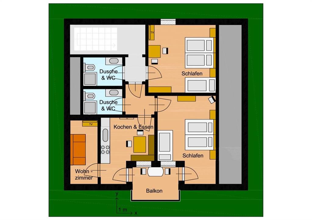 Moderne Küche, kleines Wohnzimmer, 2 Dreibettzimmer mit Safe, 2 Dusche/WC, Balkon mit Sitzgelegenheit,