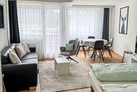 Parkareal Apt 404, 1-Zimmer-Wohnung 47 m2 im 4. Stock, Südwestlage. Vollständig renoviert im Jahre 2023, komfortabel und modern eingerichtet: offenes Wohn-/Esszimmer mit 1 Diwanbett (160 cm, Länge 200 cm), 1 Doppelbett (180 cm, Länge 200 cm), Kabel-TV (Flachbildschirm). Ausgang zum Balkon. Offene Küche (Backofen, Geschirrspüler, 4 Glaskeramikplatten, Wasserkocher, Tiefkühler, elektrische Kaffeemaschine, Kapseln für die Kaffeemaschine (Nespresso) extra). Dusche/WC. Balkon, Südlage. Balkonmöbel. Schöne Sicht auf die Berge, die Landschaft und die Ortschaft. Zur Verfügung: Internet (WLAN, gratis). Parkplatz (extra) beim Haus. Bitte beachten: Nichtraucher-Unterkunft. 12320