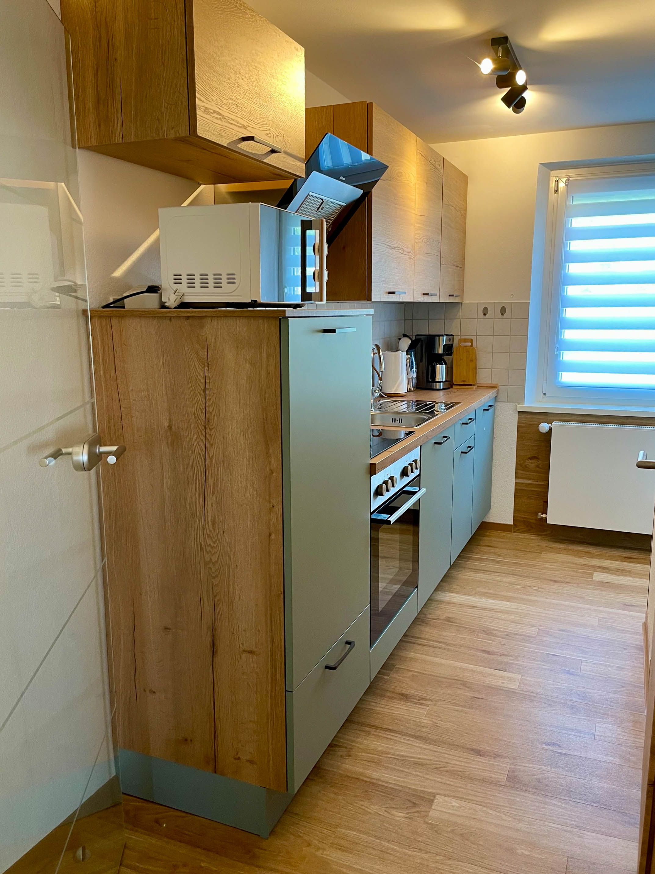 In der voll ausgestatteten Einbauküche finden Sie alles, was Sie zum Kochen benötigen: Kühlschrank mit Gefrierfach, Cerankochfeld mit Dunstabzug, Backofen, Mikrowelle, Toaster, Wasserkocher, Eierkocher, Kaffeemaschine sowie ausreichend Geschirr, Gläser, Besteck und Kochutensilien.