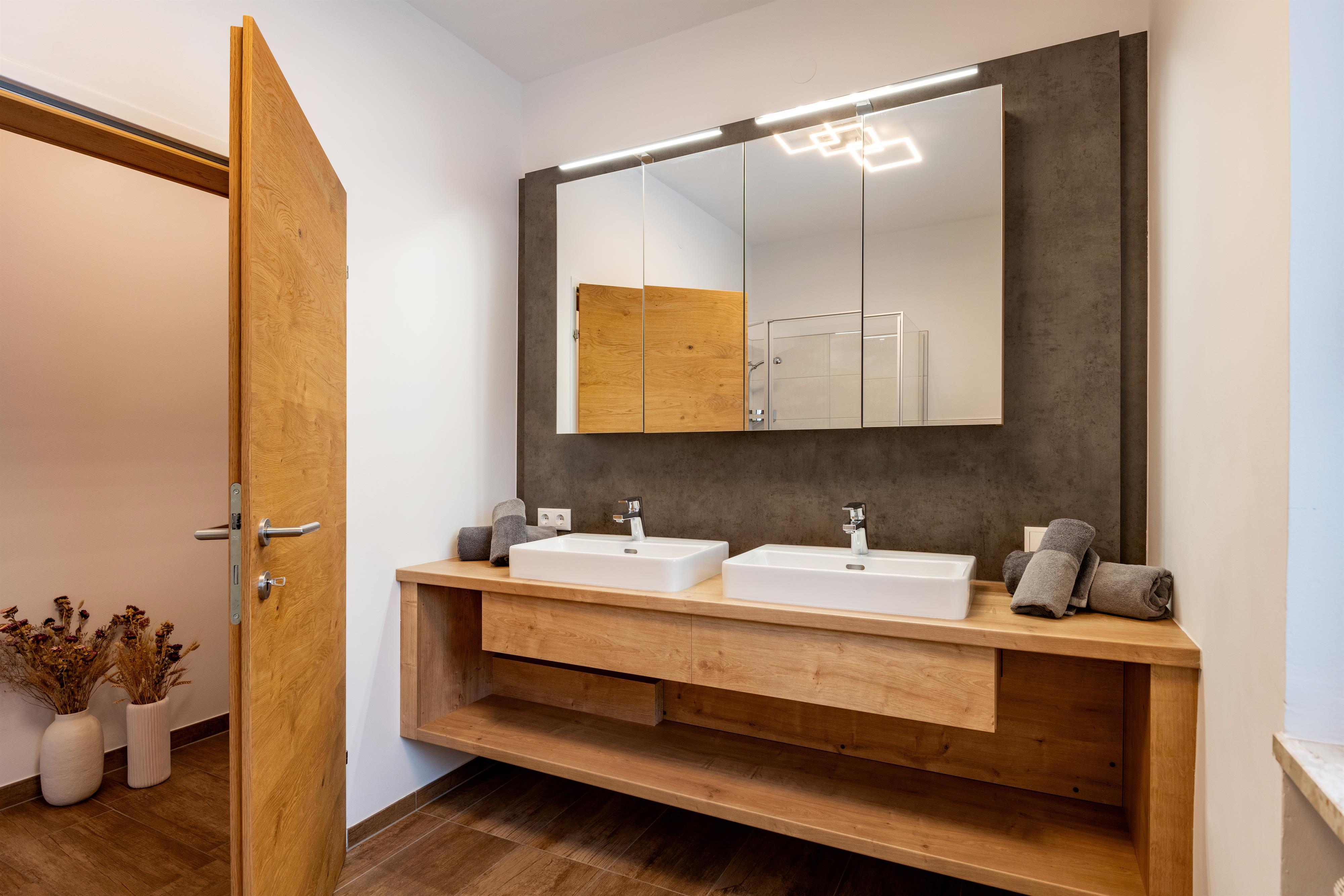 Sie besteht aus 2 Schlafzimmern mit jeweils einem Doppelbett und einem Schlafsofa, einem Schlafzimmer mit Doppelbett, einem Badezimmer mit Dusche und WC, einem Badezimmer mit WC, einer Wohnküche und einem eigenen Garten mit Grillmöglichkeit