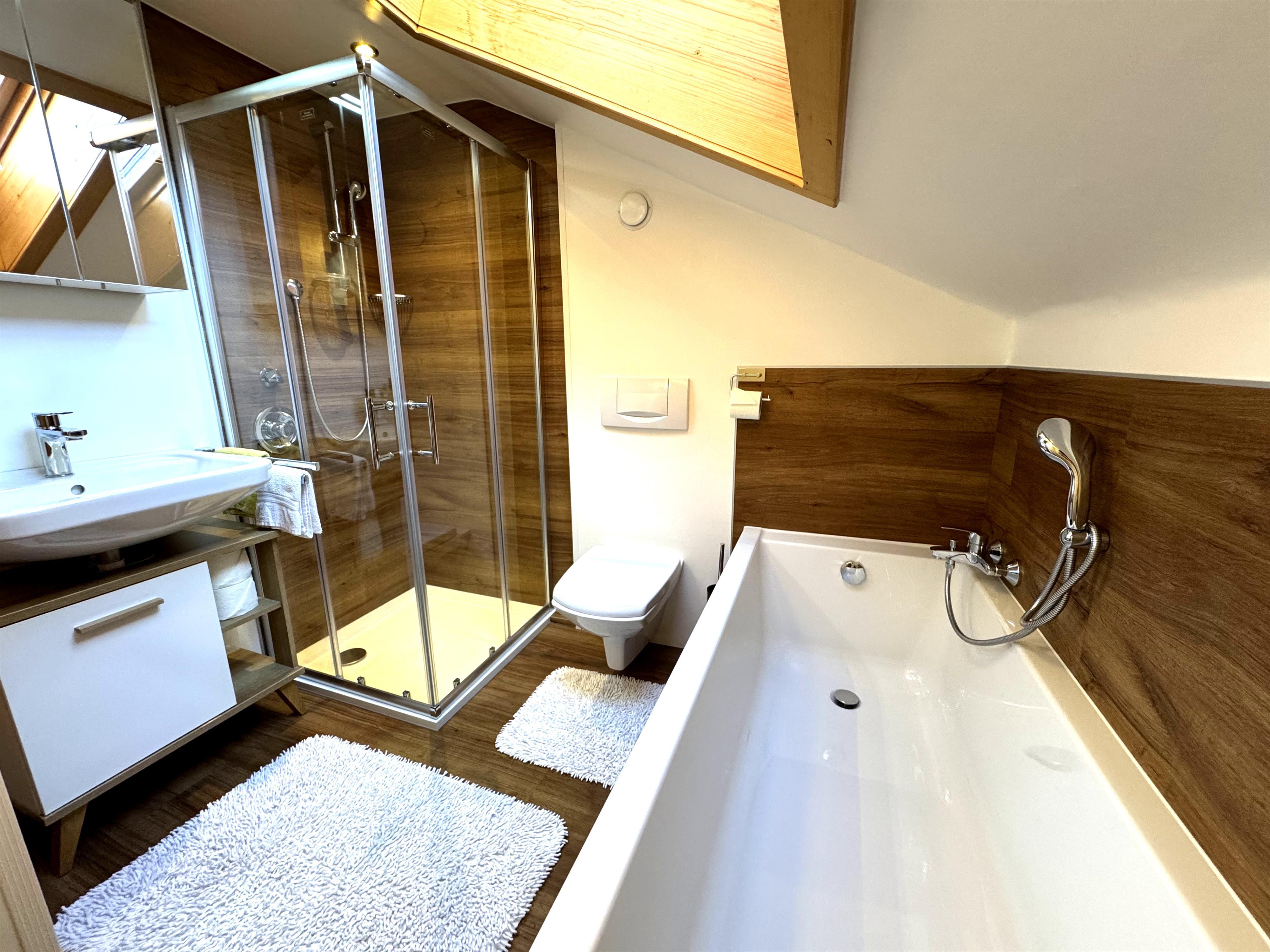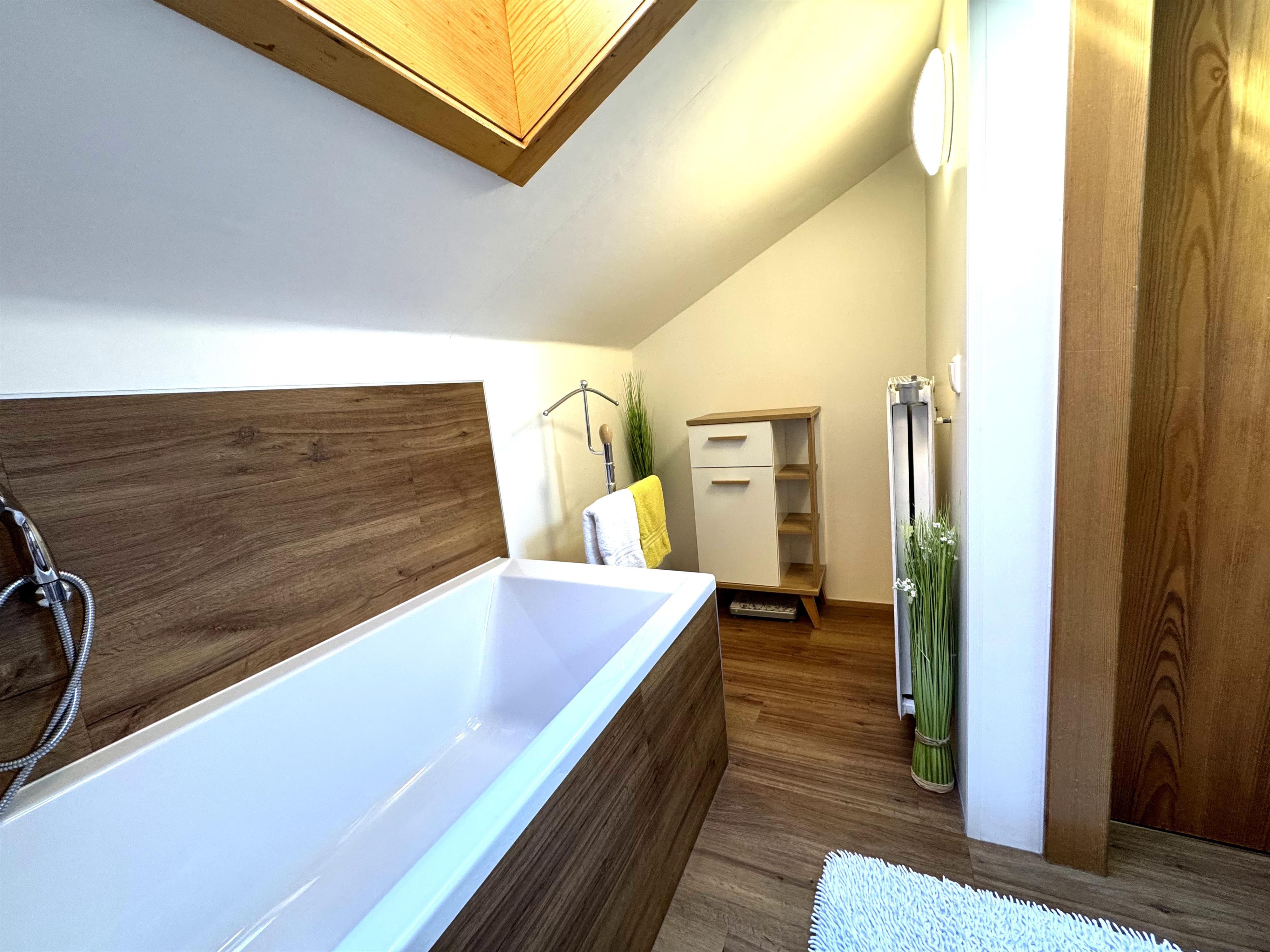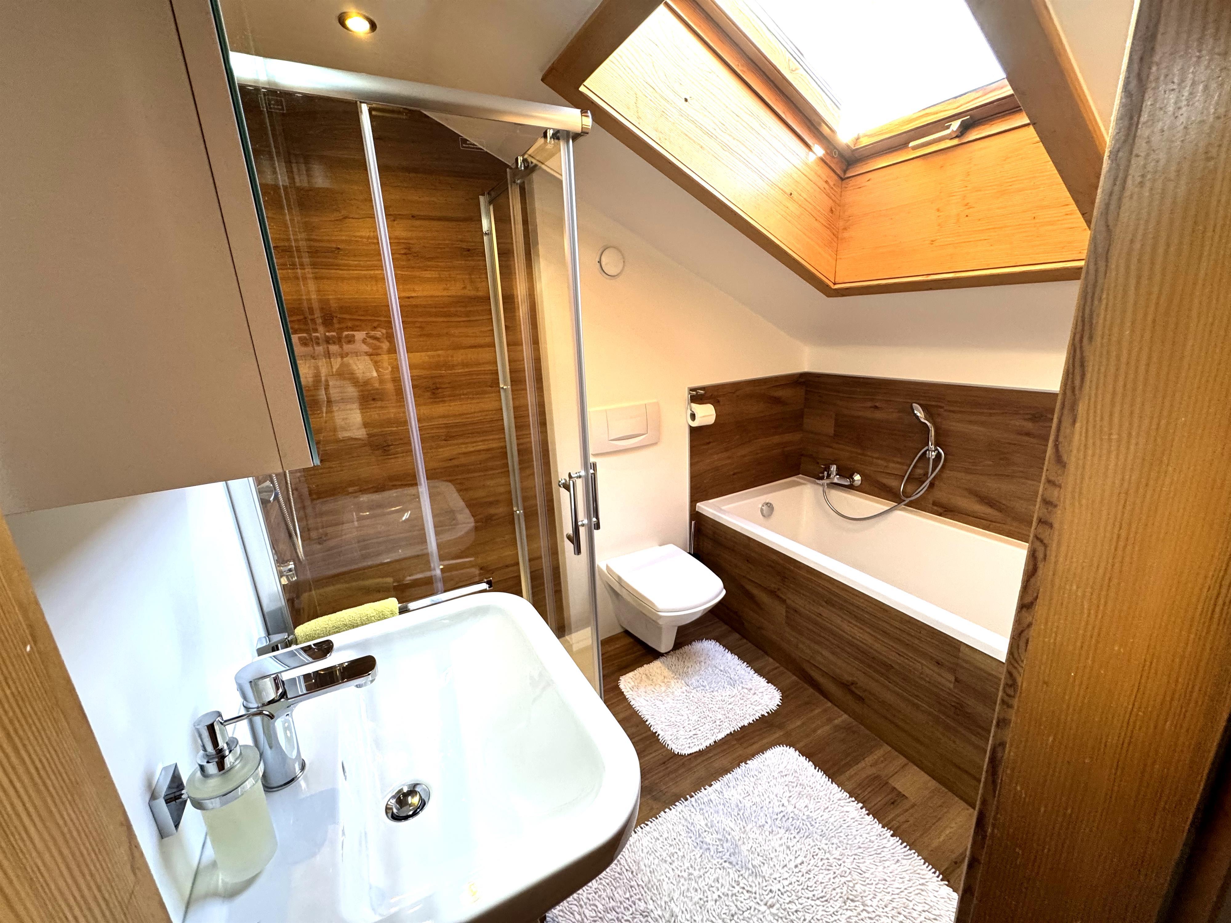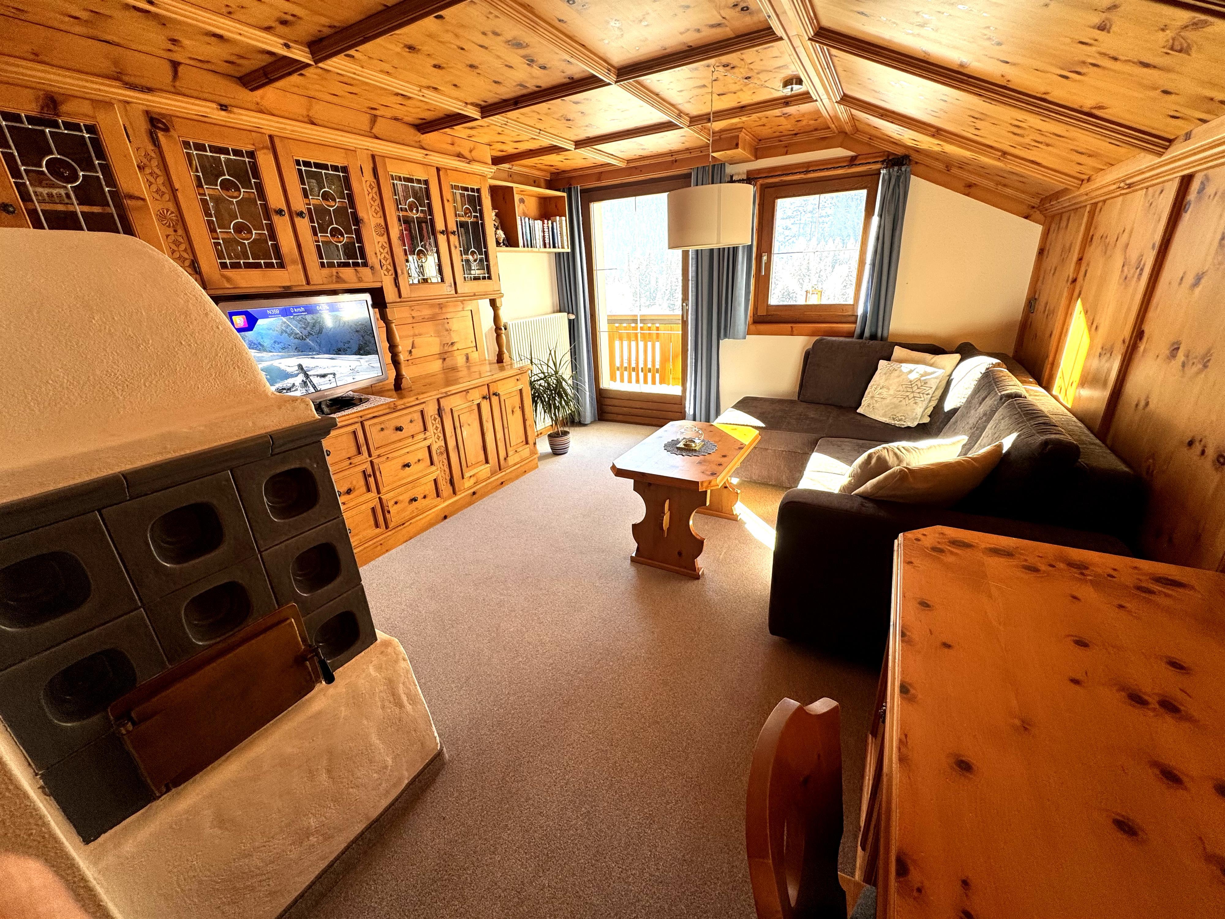 Die komfortable Ferienwohnung umfasst das gesamte Dachgeschoss. Komplette Küche (Geschirrspüler, Toaster, Backrohr, Eierkocher,..). Zirbenstube (ausziehbarer Couch), Sat-TV. 1 Schlafzimmer. Badezimmer mit Dusche, WC und Badewanne. Südseitiger Balkon.