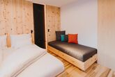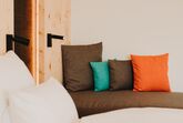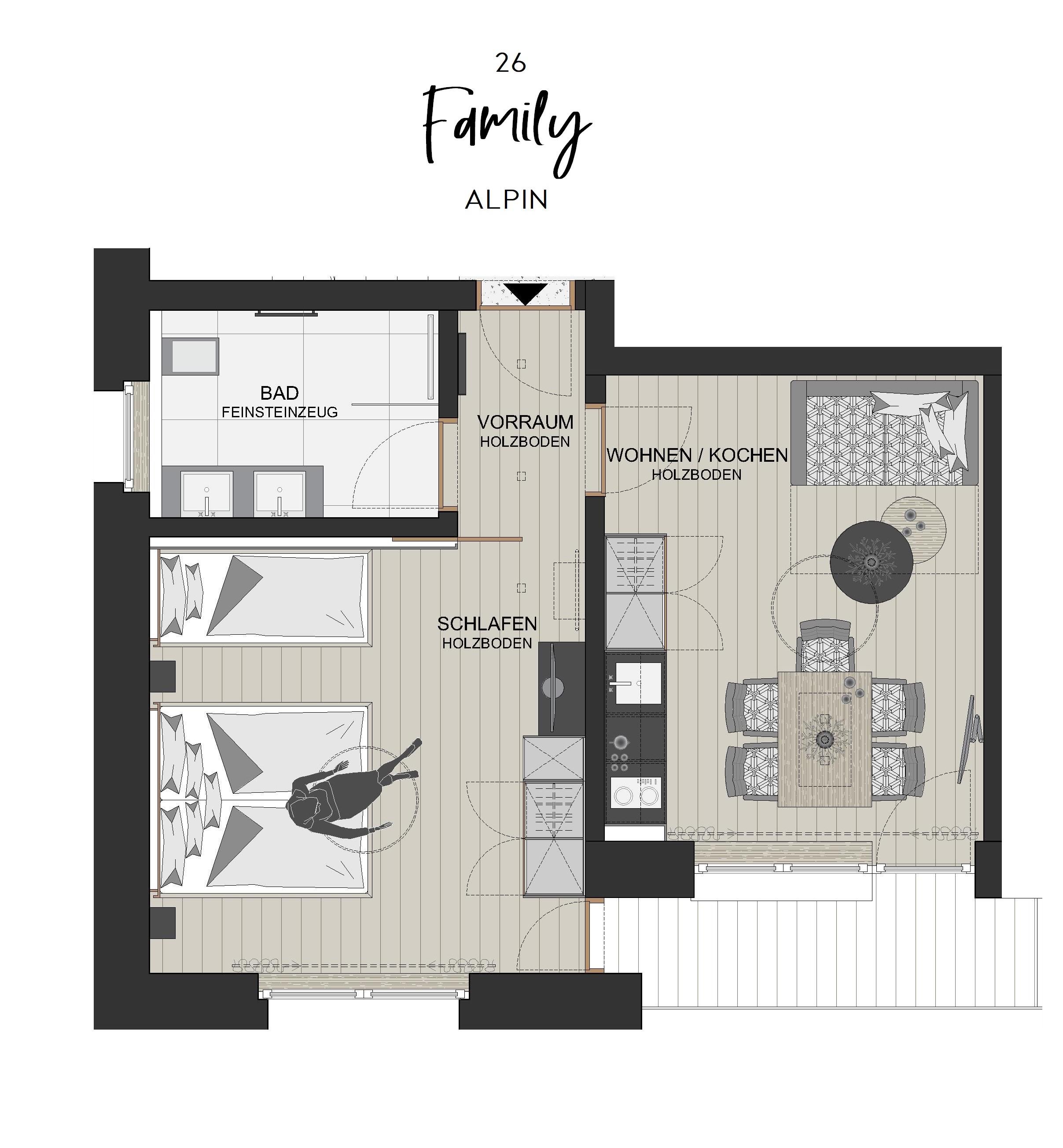 Bis zu 5 Personen einer Familie oder eine kleine befreundete Gruppe finden in den geräumigen Familienstudios Family Alpin Platz. Ein getrenntes Schlafzimmer mit Doppelbett und einem Einzelbett aus Zirbenvollholz sowie ein Wohnbereich mit hochwertiger Schlafcouch für die 4. und 5. Person sorgen für die nötige Erholung. Essbereich mit Kitchenette, Badezimmer mit Walk-In Regendusche und WC, Balkone für sonnige Stunden und panoramareiche Ausblicke. Glasfaser-TV im Schlaf- und Wohnzimmer, Telefon, Safe und kostenloses WLAN.