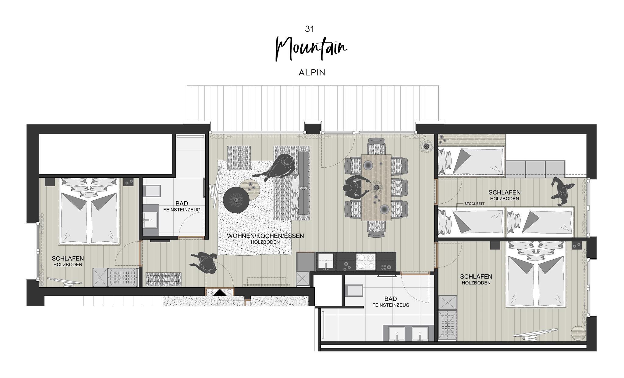 Eines unserer zwei Herzstücke, die Panoramasuite Mountain Alpin im Dachgeschoss, lässt Euer Herz höherschlagen und raubt Euch beim Ausblick auf die unverbaute Bergwelt sprichwörtlich den Atem. Großfamilien mit Oma und Opa im Gepäck oder eine Runde mit deinen Herzensmenschen, hier findet ihr Euer perfektes Urlaubsdomizil. Umgeben von Fichtenvollholz, eingerichtet mit natürlichen Materialien in Kombination mit dunklen Akzenten besticht diese Suite mit einer exklusiven Ausstattung. Drei separate Schlafzimmer, davon zweimal mit Doppelbetten und Glasfaser-TV eingerichtet, das dritte Zimmer bietet ein Stockbett und zwei Einzelbetten. Großzügiger und offen gestalteter Wohn-Essbereich mit vollausgestatteter Küche (ohne Mikrowelle), Glasfaser-TV und raumhohe Glasfronten. Zwei Badezimmer mit Walk-In Regendusche und WC’s. Telefon, Safe und kostenloses WLAN.